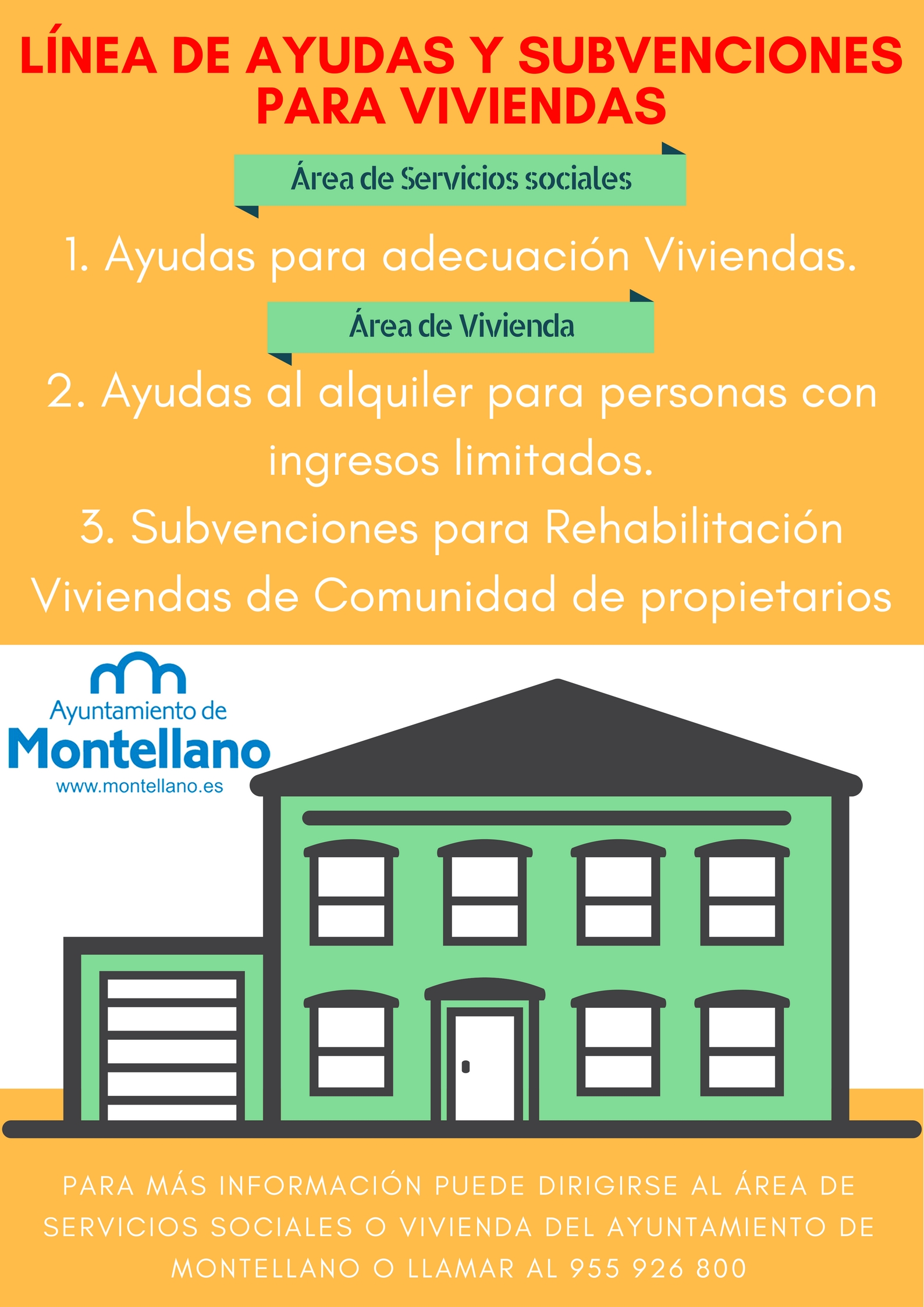 Desde el Ayuntamiento de Montellano se informa a los vecinos/as de las líneas de ayudas y subvenciones que actualmente tiene abierta la Consejería de Vivienda y Fomento, relativas a ayudas al alquiler a personas con ingresos limitados, subvenciones destinadas al fomento de la rehabilitación edificatoria y ayudas para la adecuación funcional de viviendas para mayores de 65 años o con algún miembro con discapacidad y movilidad reducida. Pueden obtener más información descargando el siguiente documento.