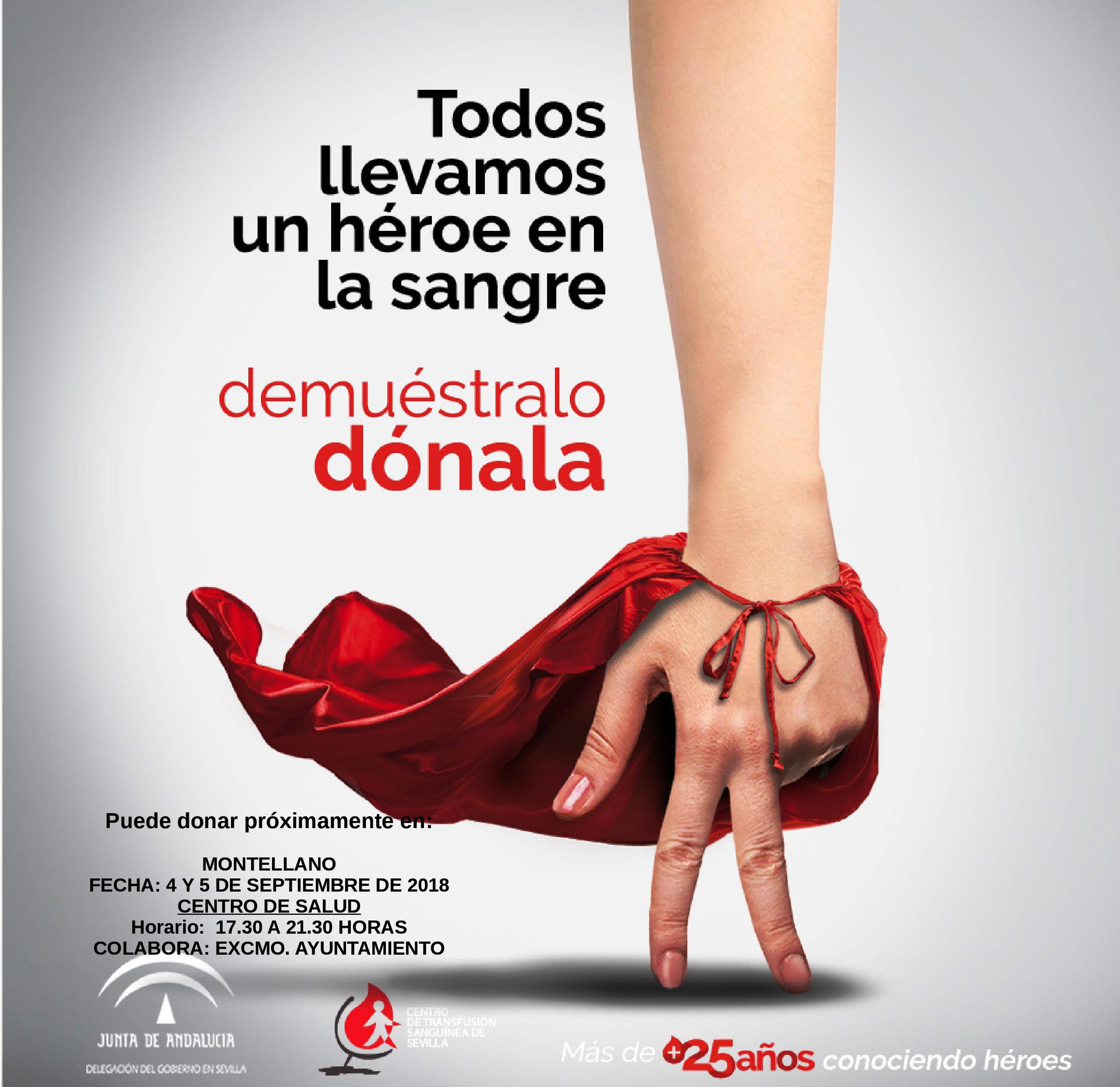 El próximo martes 4 y miércoles 5 de septiembre tendrá lugar una Campaña de Donación de Sangre en Montellano. Se realizará en el Centro de Salud de la localidad, de 17:30 a 21:00 horas . Se necesita sangre de todos los grupos sanguíneos.