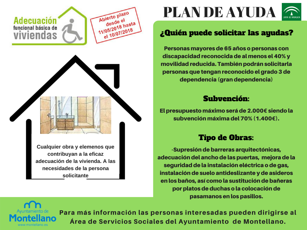 Desde el Ayuntamiento de Montellano te informamos de que hasta el 10 de Julio de 2018 permanecerá abierto el plazo de solicitud del Programa de adecuación funcional básica de viviendas del "Plan de Vivienda y Rehabilitación de Andalucía 2016-2020" para el ejercicio 2018, Orden de 2 de Mayo de 2018 publicada en el BOJA Número 89.