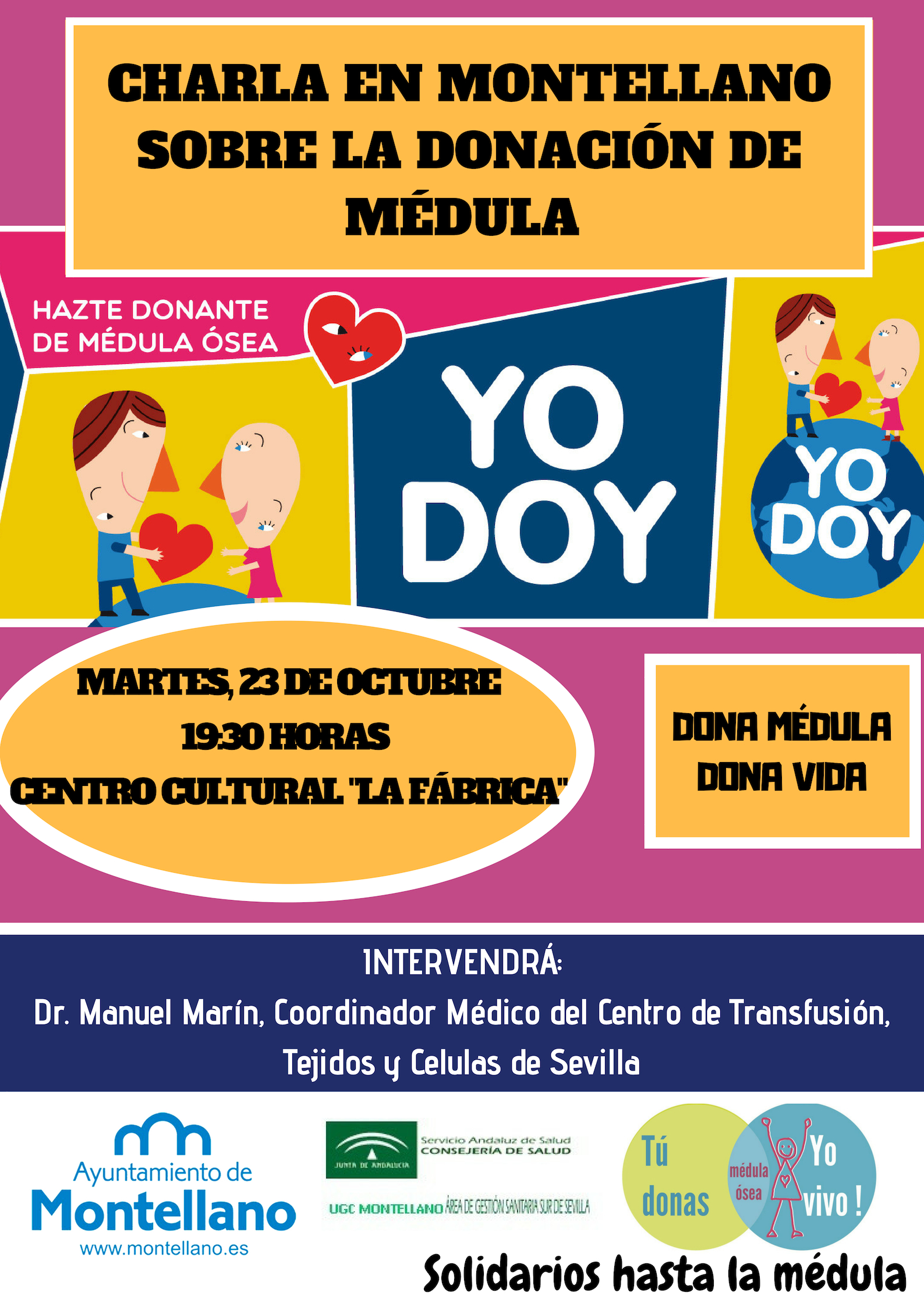 El martes 23 de octubre a las 19:30 horas en el Centro Cultural "La Fábrica", se celebrará una charla informativa sobre la donación de médula. El objetivo de la charla es informar de primera mano y a cargo del D r. Manuel Marín, Coordinador Médico del Centro de Transfusión, Tejidos y Celulas de Sevilla, a todas las personas interesadas en ser donantes de médula .