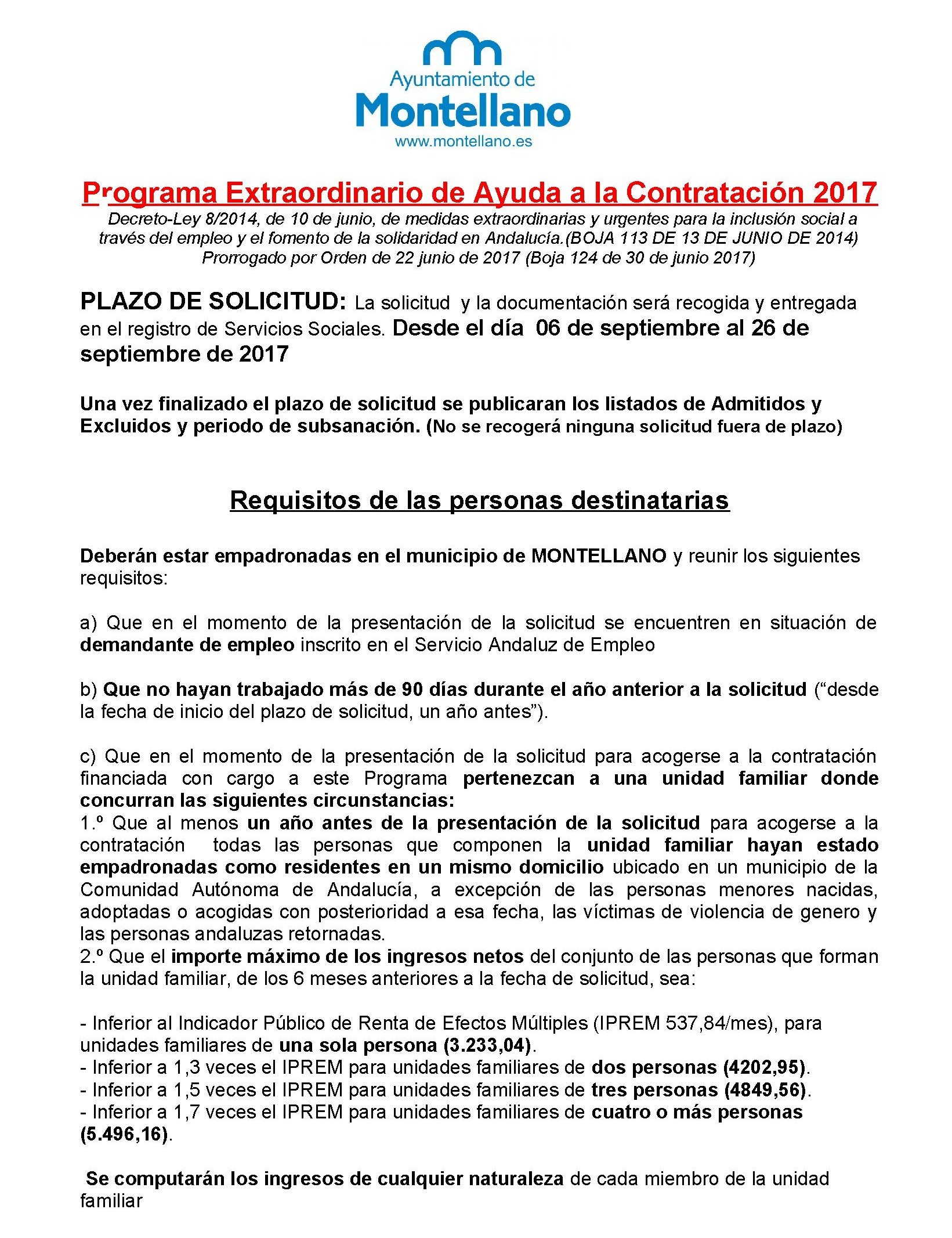 Desde el área de Bienestar Social se informa que del 6 al 26 de septiembre queda abierto el plazo para solicitar el Programa Extraordinario de Ayuda a la Contratación 2017 (decreto-Ley 8/2014, de 10 de junio, de medidas extraordinarias y urgentes para la inclusión social a través del empleo y el fomento de la solidaridad en Andalucía).