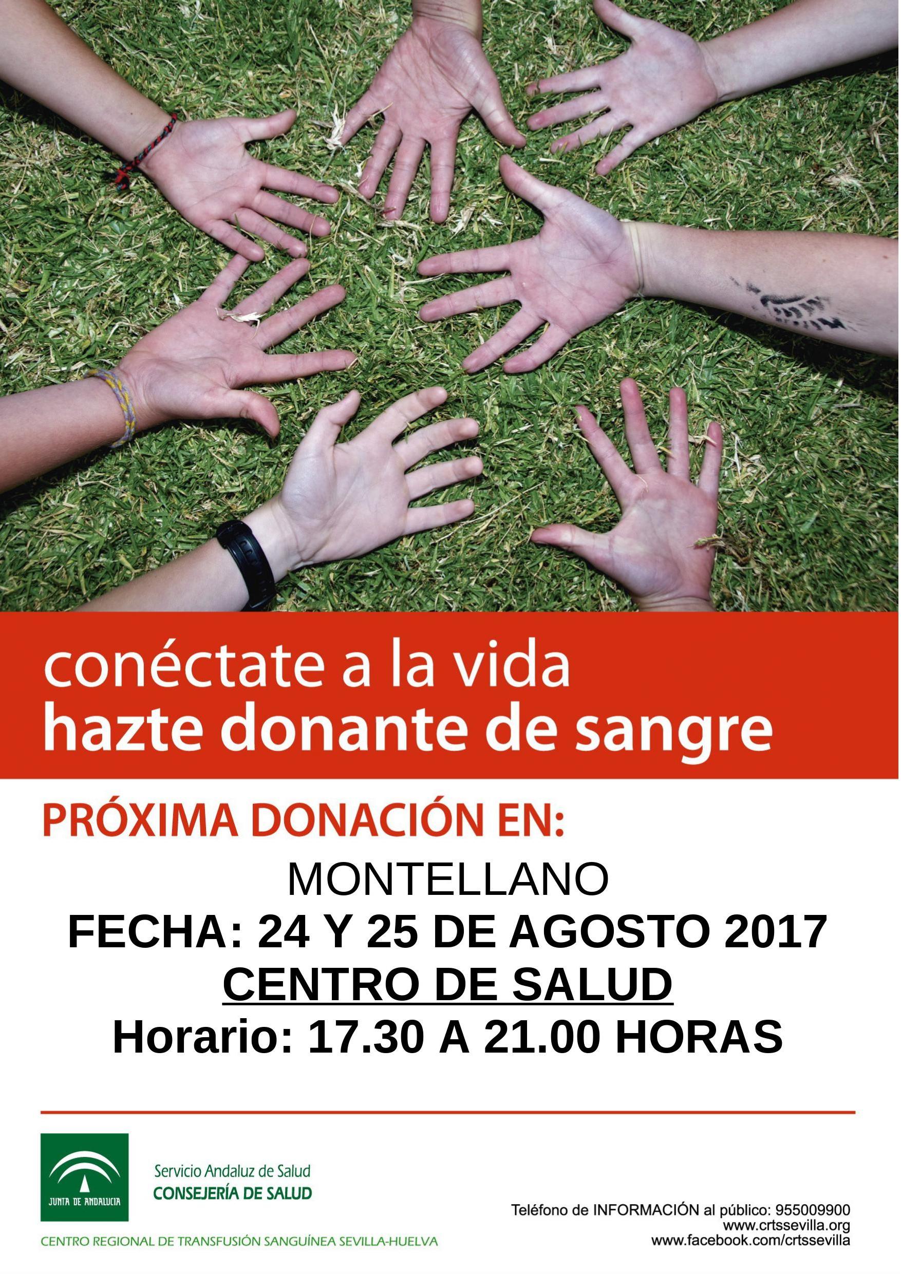 El JUEVES 24 Y VIERNES 25 DE AGOSTO habrá una campaña de donación de sangre en MONTELLANO. Será en EL CENTRO DE SALUD en horario de 17.30 a 21.00 horas.