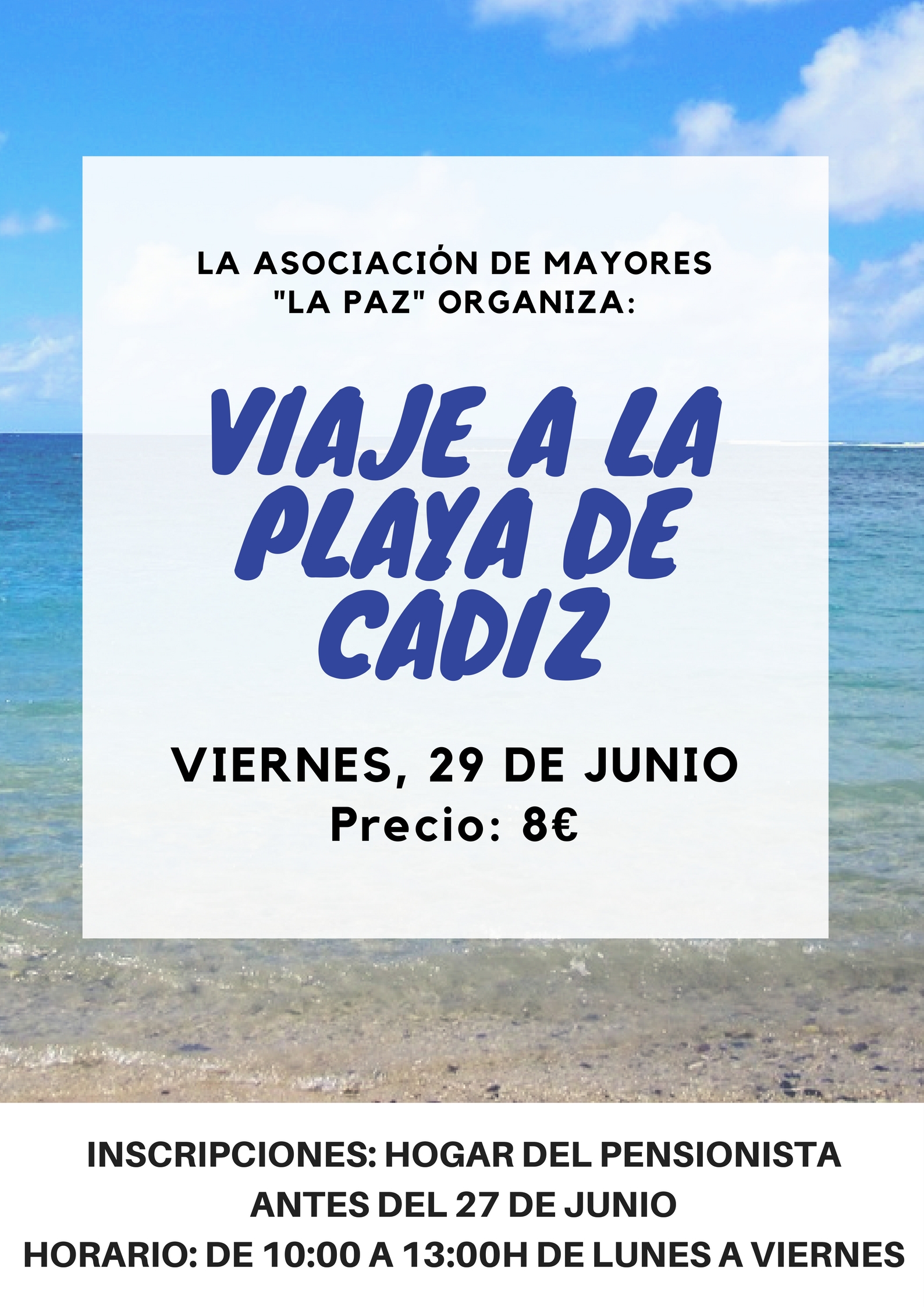 La Asociación de Mayores "La Paz" organiza un viaje a la Playa de Cádiz para el próximo 29 de junio.