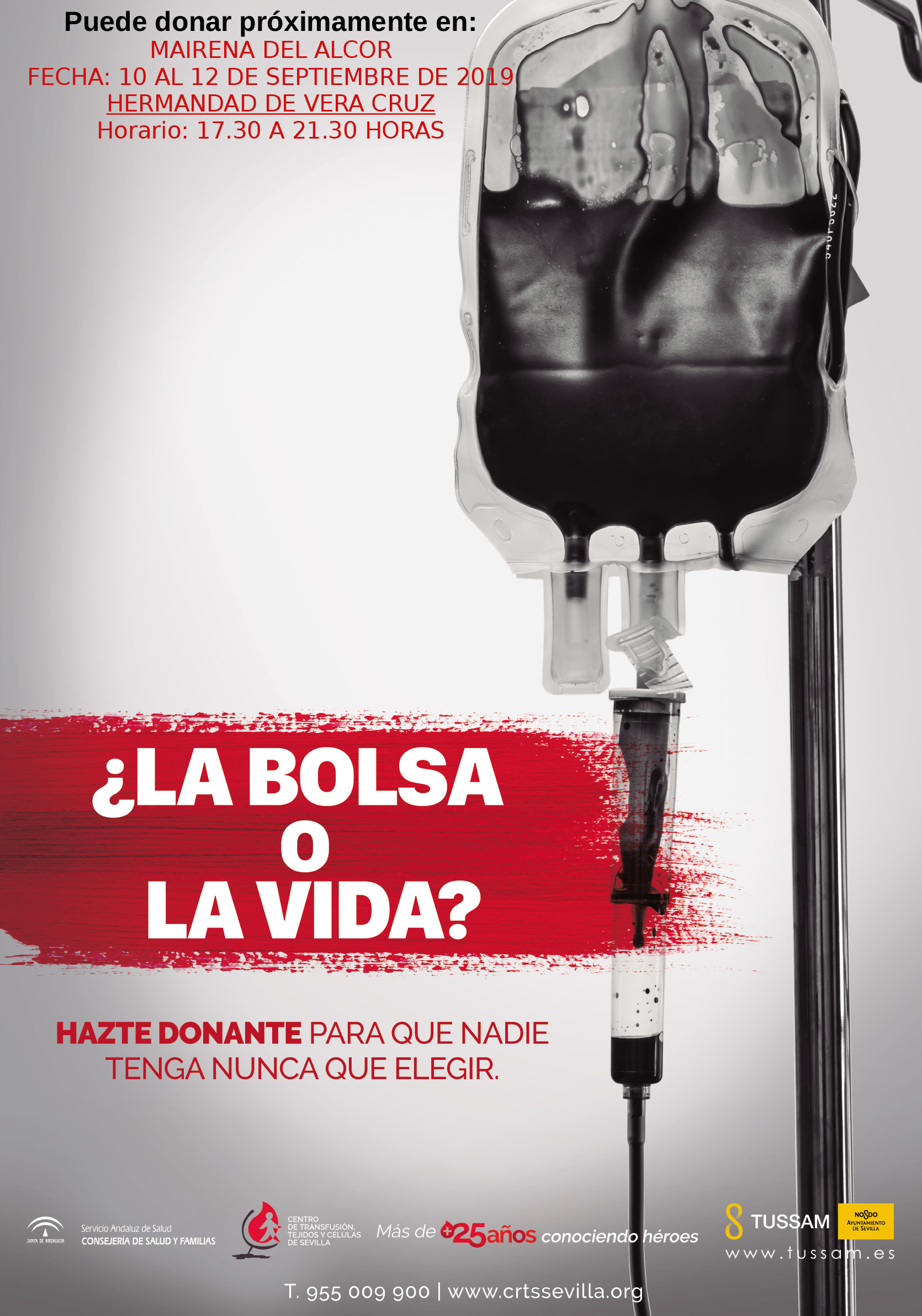 El Centro de Transfusión Sanguínea de Sevilla organiza una nueva campaña de donación de sangre en la casa hermandad de la Vera-Cruz (calle Tomás de Paz, 13) del 10 al 12 de septiembre en horario de 17:30 a 21:30 horas.