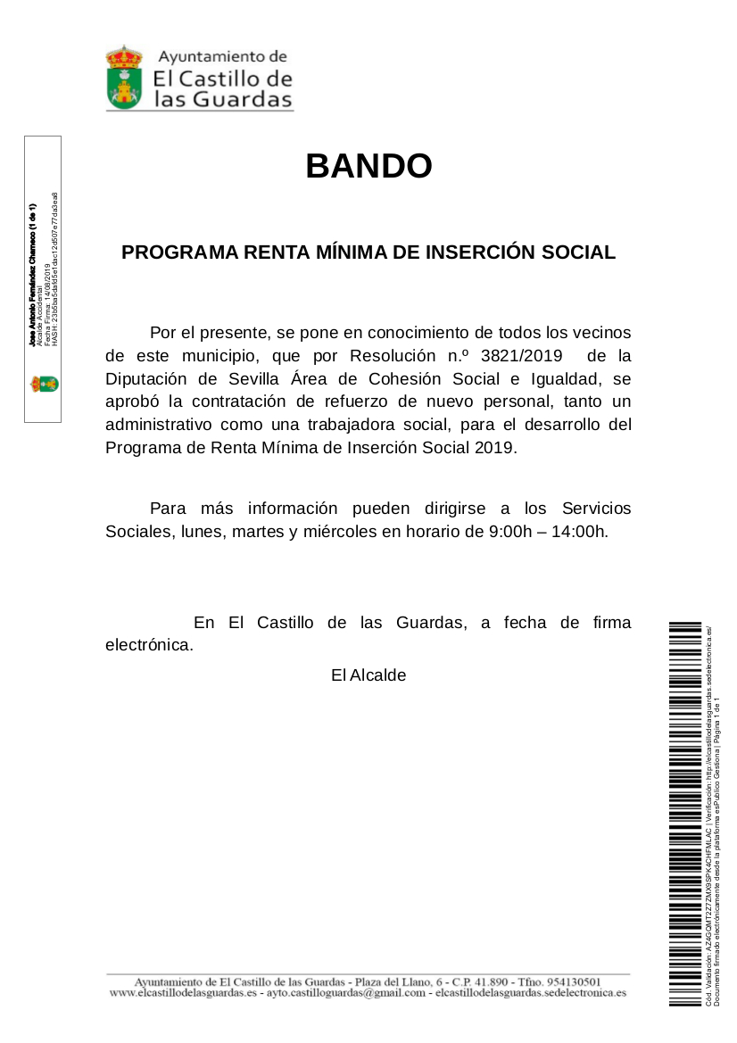 Desde la Diputación de Sevilla se financiará la contratación de una Trabajadora Social y una Administrativa hasta Diciembre 2019 en el Ayto., para agilizar la tramitación de las peticiones del Programa de Renta Mínima de Inserción Social 2019. Dicho Programa trata de una prestación económica para los vecinos/as empadronados en nuestro municipio y que se encuentren en situación de exclusión/emergencia social o riesgo de estarlo y cumplan con los requisitos exigidos.