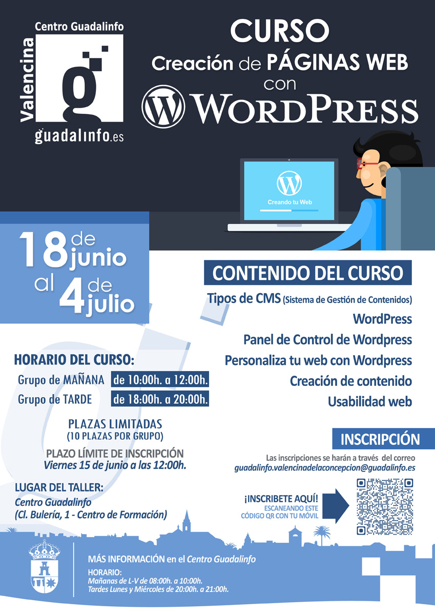 El Centro Guadalinfo de Valencina de la Concepción ha abierto inscripción, hasta el próximo 15 de junio, para todas aquellas personas interesadas en aprender a crear páginas web por medio de la herramienta WordPress.