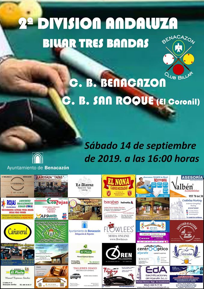 Desde el Ayuntamiento de Benacazón te informamos sobre el encuentro de Segunda Division Andaluza de "Billar a Tres Bandas", Segunda División Andaluza, que tendrá lugar el sábado 14 de septiembre de 2019 a las 16.00 horas en la sede del Club de Billar de Benacazón (Camino Rebujena, 1), contando con la participación del Club local y el Club de San Roque de El Coronil.