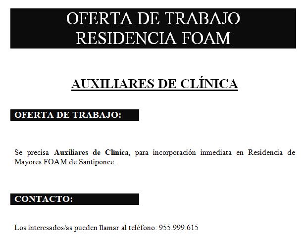 - Oferta de empleo en la Residencia FOAM de Santiponce para auxiliares de clínica: