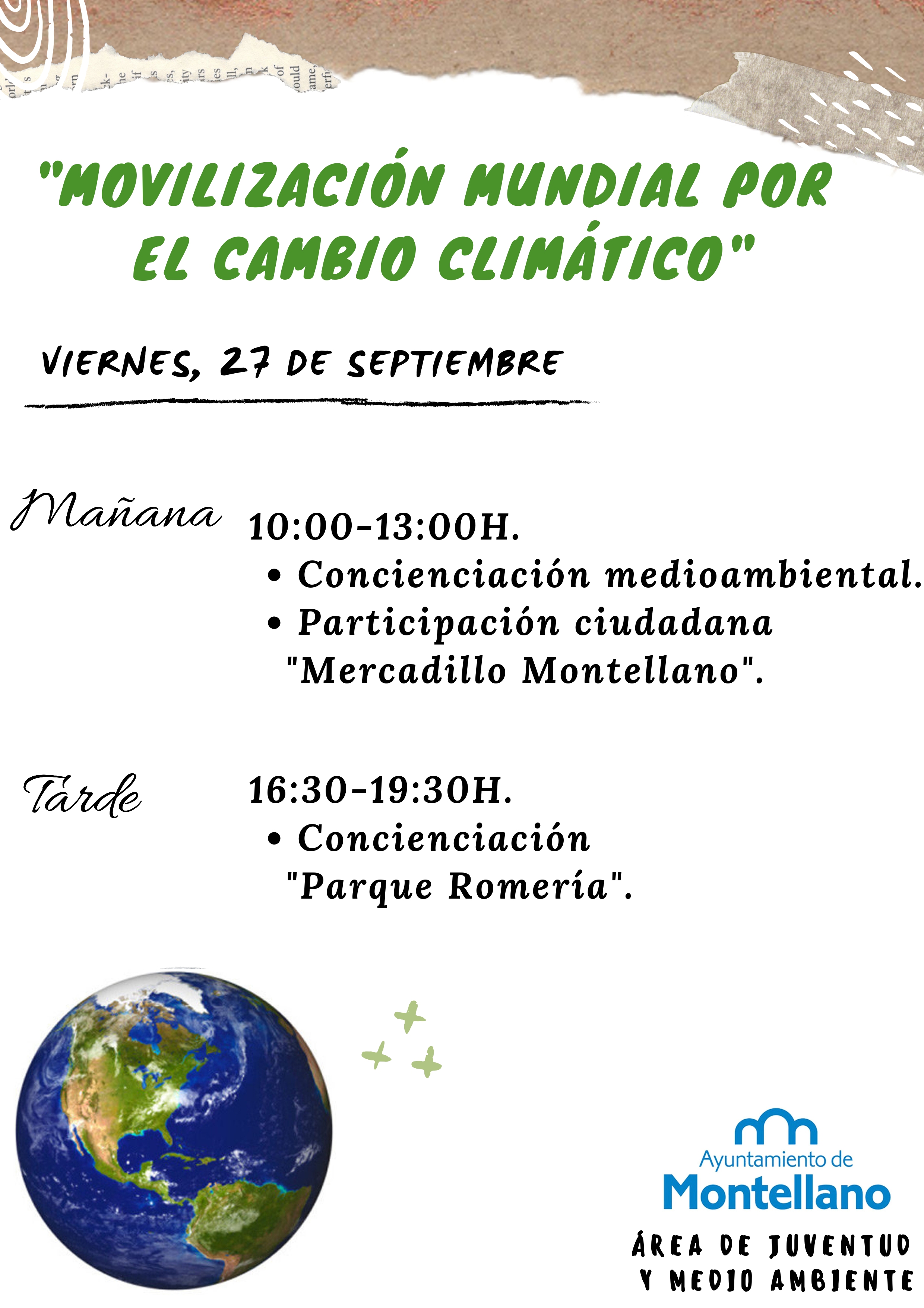 Esta campaña de sensibilización se desarrollará principalmente el viernes 27 de septiembre y su objetivo es hacer un llamamiento a la ciudadanía en general para que se implique frente al Cambio Climático. Además se está haciendo la campaña "CREA CONCIENCIA MONTELLANO" a través de las redes sociales, con el fin de concienciar a la ciudadanía sobre las necesidades de cuidar de nuestro medio ambiente.