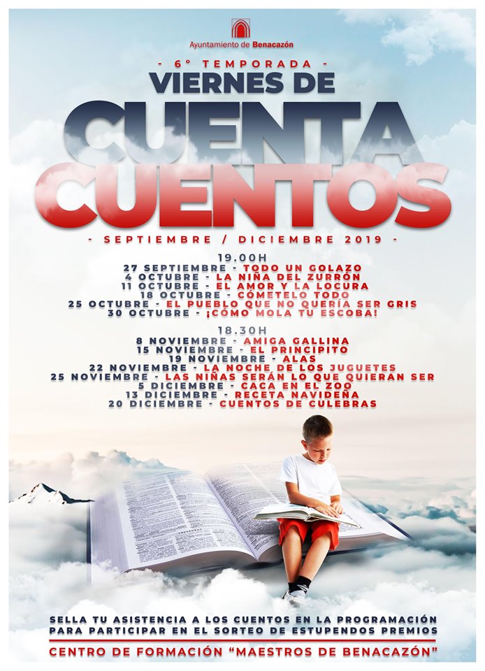 Desde finales de septiembre hasta finales de diciembre de 2019 en el Centro de Formación "Maestros de Benacazón", la nueva edición de Viernes de Cuentacuentos incluirá un completo programa de 14 fantásticas y divertidas historias de muchas temáticas y estilos diferentes narrados nuevamente gracias a la colaboración de un gran número de voluntarios y voluntarias: