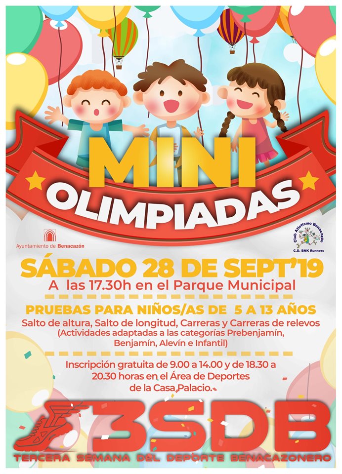 Desde el Ayuntamiento de Benacazón te presentamos las MiniOlimpiadas que tendrán lugar el sábado 28 de septiembre de 2019 a partir de las 17.30h en el Parque Municipal. Esta actividad integrada en la 3SDB está organizada por el Área municipal de Deportes con la colaboración del Club de Atletismo BNK Runners