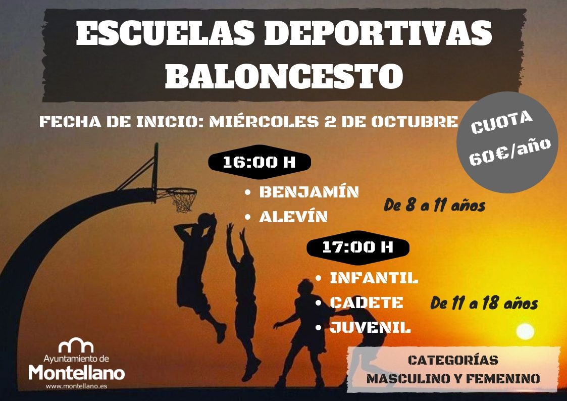 La escuelas de baloncestos comenzarán el próximo miércoles día 2 de octubre citando a todos los interesados y interesadas en doble convocatoria a las 16.00 h para las categorías benjamín y alevín y a las 17.00 h para las categorías infantil, cadete y juvenil.