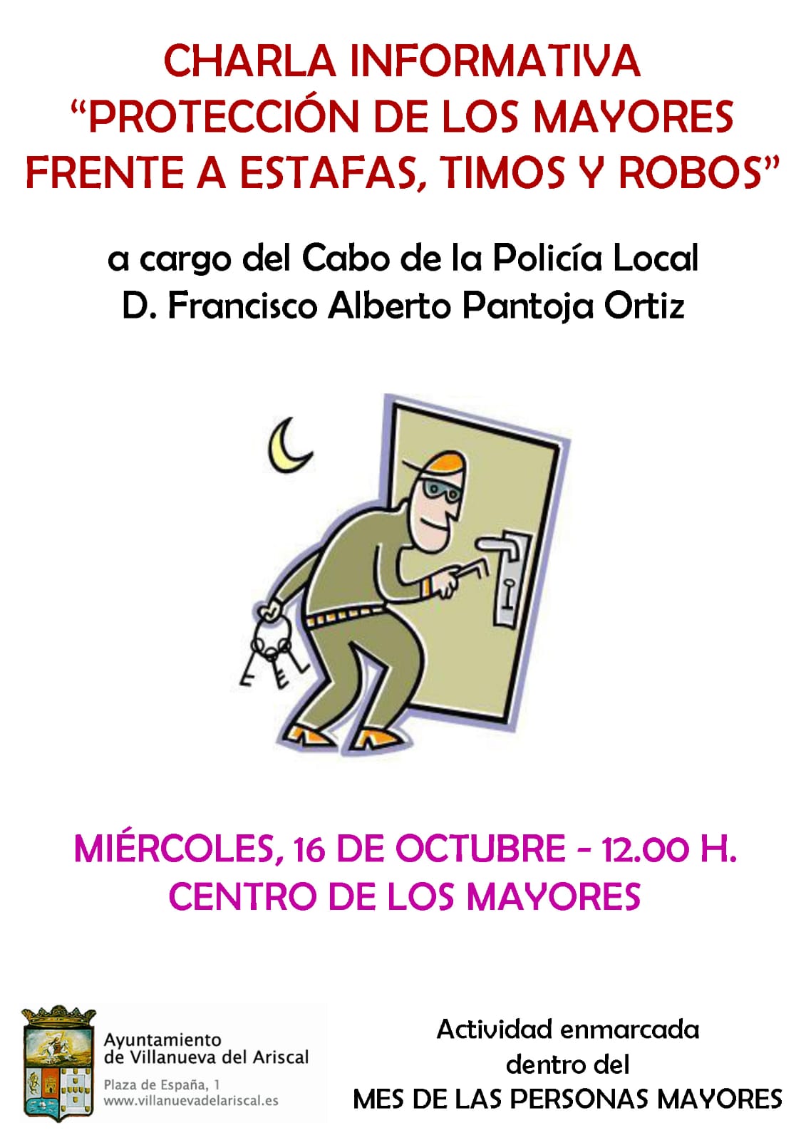 Charla "Protección del Mayor frente a estafas, timos y robos" por el Cabo de la Policía Local en el salón del Centro de Mayores.