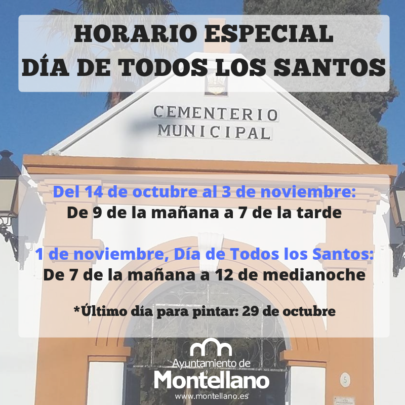Les informamos que de cara a la festividad de los Santos, el Cementerio Municipal abrirá en horario de 9 de la mañana a 7 de la tarde hasta el próximo 3 de noviembre . No obstante, el día 1 de noviembre (día de Todos los Santos) su horario será de 7 de la mañana a 12 de la medianoche.