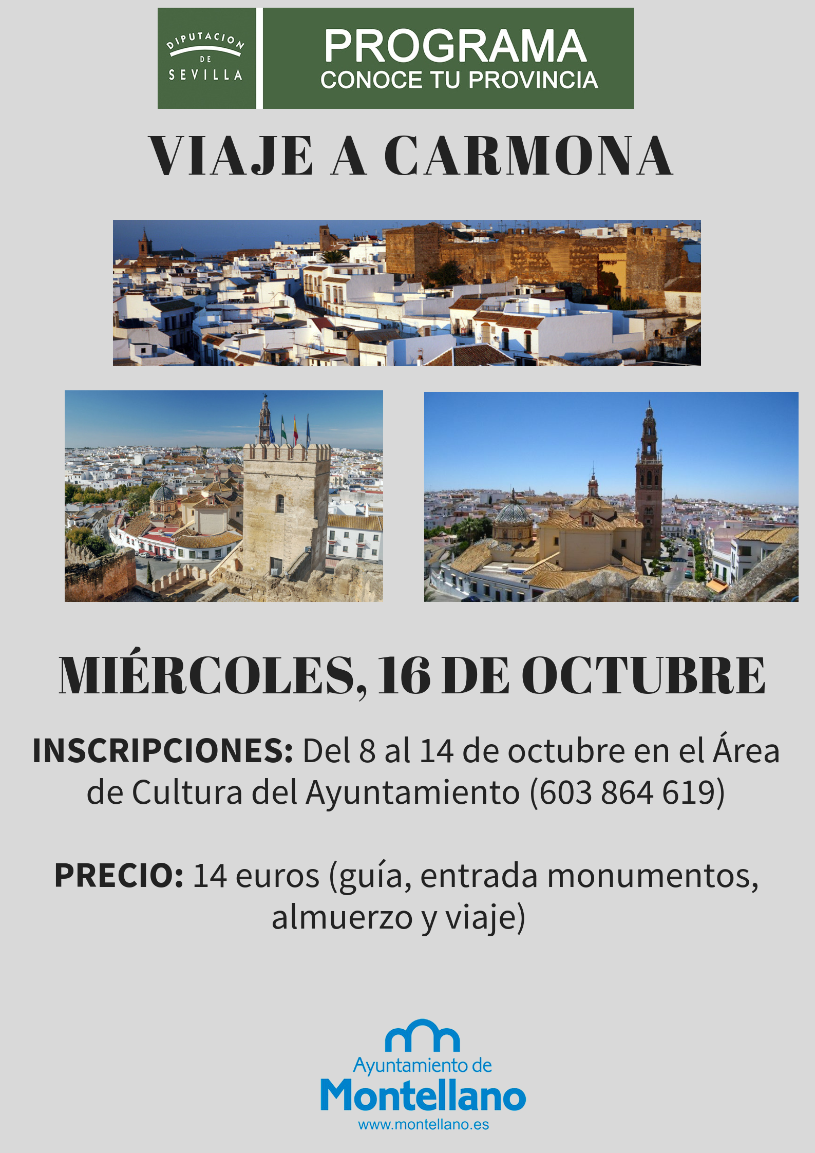 Las inscripciones al viaje podrán realizarse en el área de Cultura del Ayuntamiento de Montellano del 8 al 14 de octubre o bien llamando al 603864619.