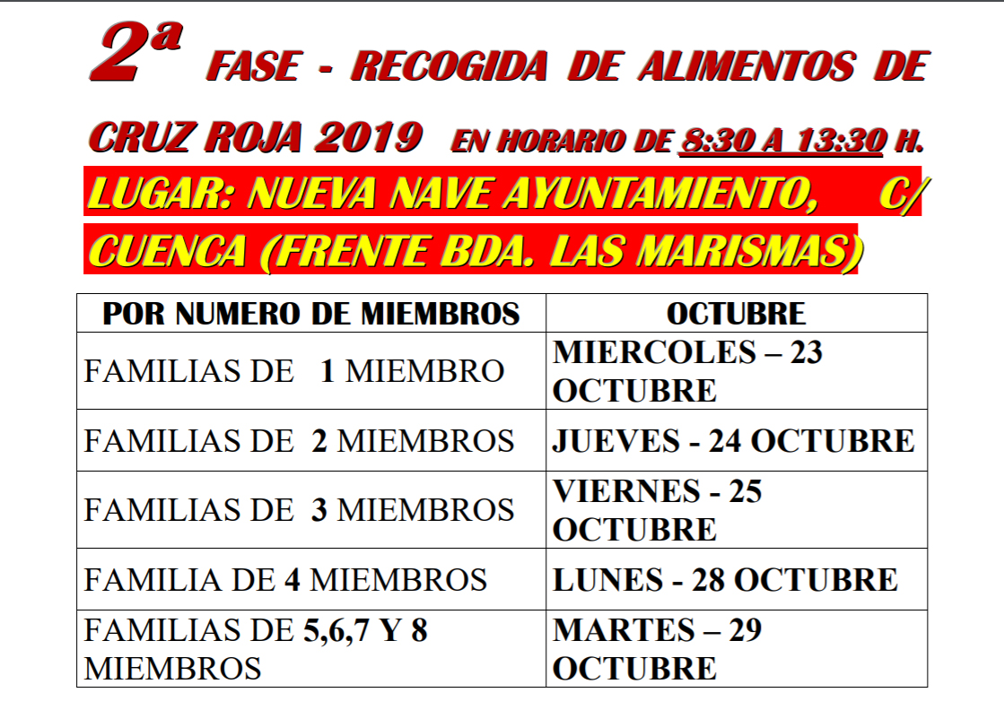 Desde el Ayuntamiento de La Puebla del Río ofrecemos la información sobre el reparto de alimentos correspondiente a la segunda fase del programa de Cruz Roja, que se efectuará del 23 al 29 de octubre en la nueva nave del Consistorio, ubicada en la calle Cuenca (frente a la Barriada de las Marismas), en horario de 08:30 a 13:30 horas.