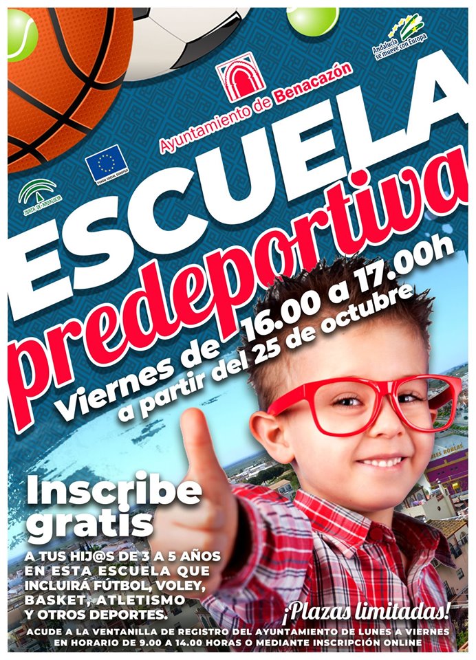 Desde el Ayuntamiento de Benacazón te invitamos a que te inscribas en la nueva Escuela PreDeportiva de Benacazón Otoño-Invierno 2019 que comenzará a impartirse a partir del próximo viernes 25 de octubre. Esta escuela se desarrollará los viernes de 16.00 a 17.00 horas en el Polideportivo Municipal e incluye la iniciación a deportes como baloncesto, fútbol, vóley, atletismo y otras disciplinas.
