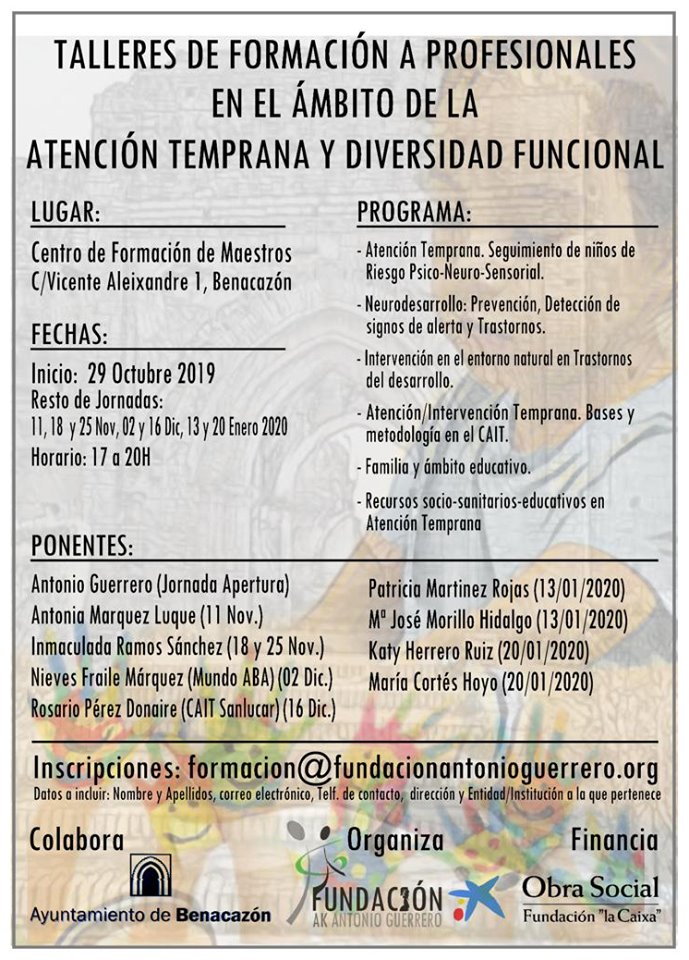 Este curso gratuito tiene por objetivo formar en materia de atención temprana y diversidad funcional a profesionales del ámbito de intervención de servicios sociales, educadores y otros profesionales de Benacazón durante varios meses. Estas jornadas se impartirán de 17.00 a 20.00 horas hasta el 20 de enero de 2020 en el Centro de Formación "Maestros de Benacazón" por parte de reputados profesionales.