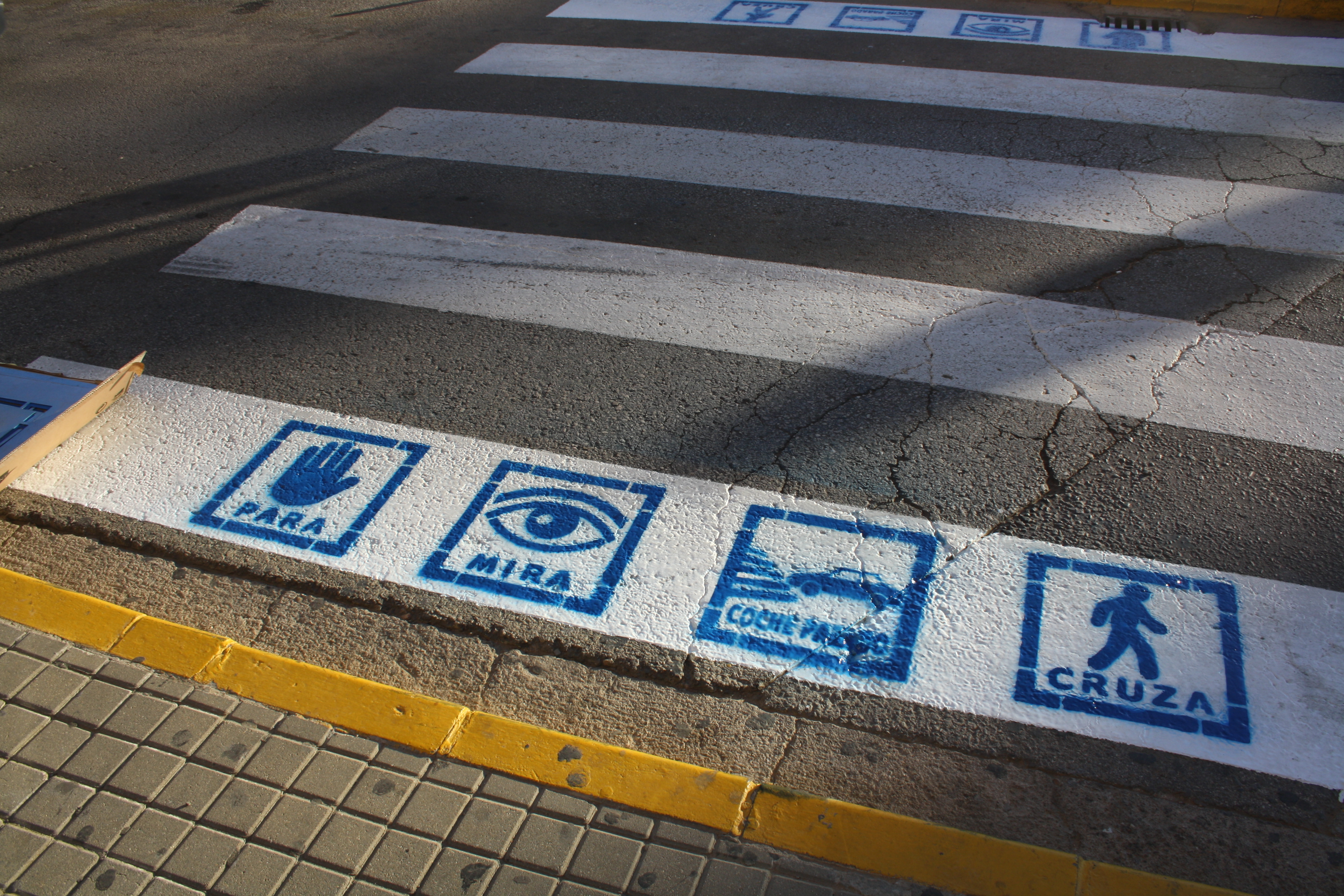 Los pictogramas son cuatro: para, mira, coche parado y cruza. Están ordenados de forma lógica, con un tamaño y color adecuado y se pintan en la primera franja de los pasos de peatones a ambos lados. Está demostrado que funcionan y ayudan a las personas con dificultades cognitivas a mantener una circulación vial más segura.