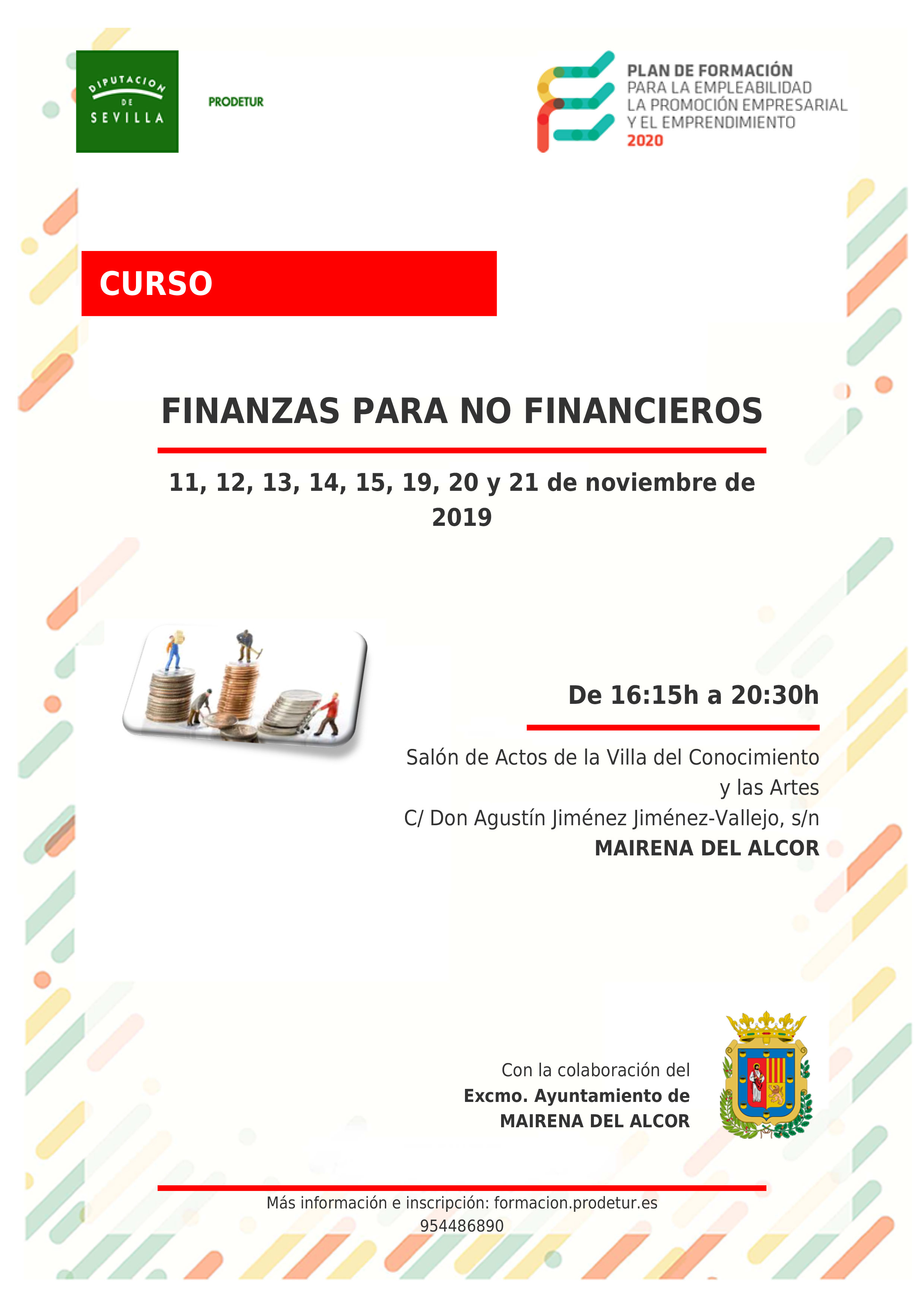 Finanzas para no financieros es un curso presencial que impartirá Prodetur, dentro de su Plan de formación para la empleabilidad, la promoción empresarial y el emprendimiento 2020, con la colaboración del Ayuntamiento de Mairena del Alcor.
