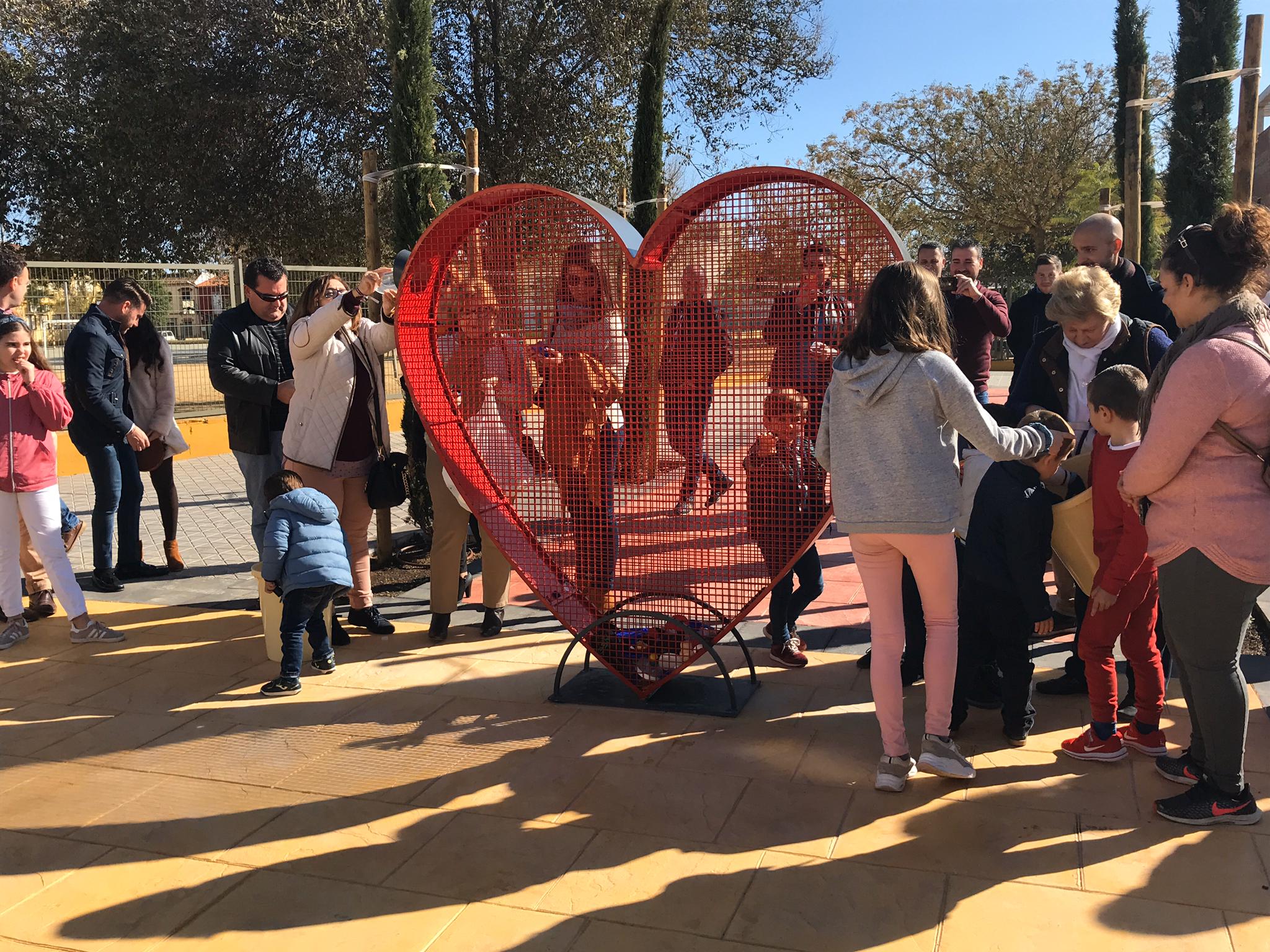 Adultos y niños que asistieron a la inauguración de la plaza estrenaron el contenedor, depositando tapones en su interior. Alberto Galeote, arquitecto a cargo del diseño del 'Corazón Solidario' indicó que se ha forjado a partir de una estructura de hierro cuadriculada en color rojo y que permite verter el plástico a través de dos aperturas, una en la parte superior y otra en la parte inferior. De esta forma, se cumple la propuesta inicial de crear un espacio de accesibilidad plena, puesto que la apertura más baja se ha dispuesto a una altura apta para personas con movilidad reducida.