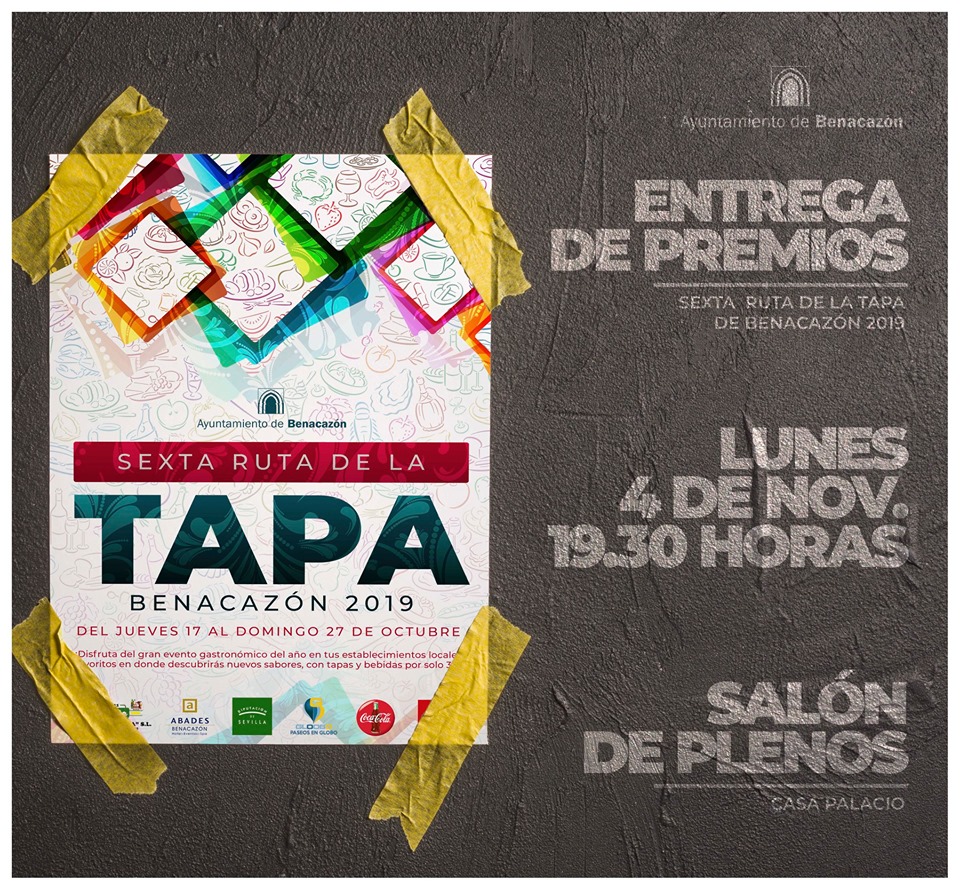 Desde el Ayuntamiento de Benacazón te informamos sobre el acto de entrega de los Premios de la Sexta Ruta de la Tapa y Ruta Infantil de Benacazón 2019, que tendrá lugar el lunes 4 de noviembre a las 19.30 horas en el Salón de Plenos de la Casa Palacio.