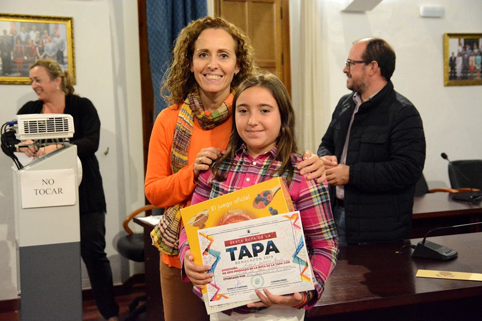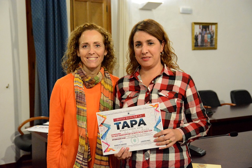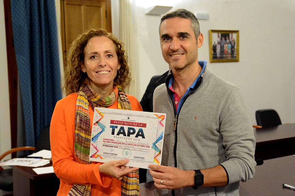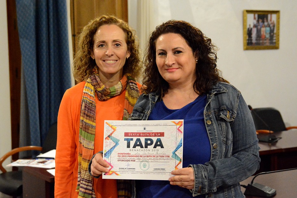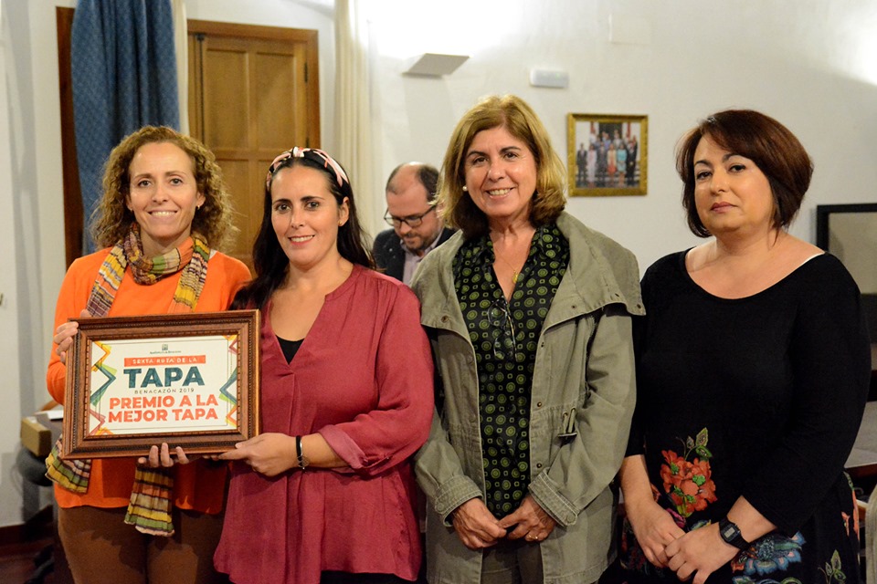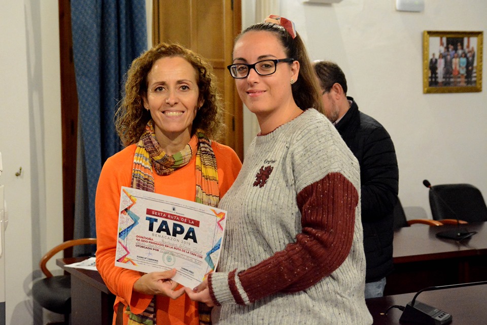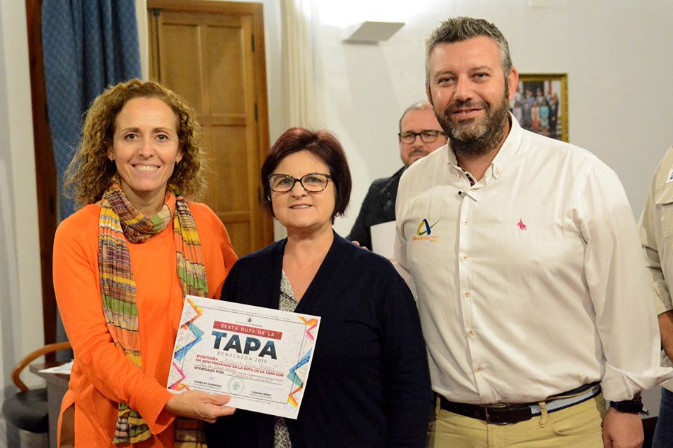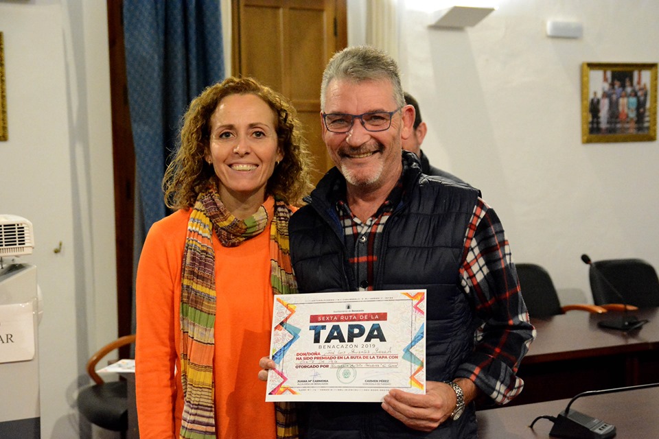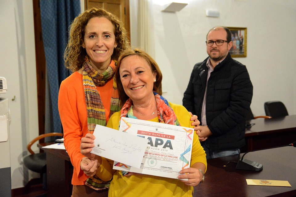 Tras el acto de entrega de premios, la Alcaldesa Juana Mª Carmona y una representación del Equipo de Gobierno procedió a la entrega de un azulejo conmemorativo de la Sexta Ruta de la Tapa en reconocimiento a la Mejor Tapa 2019, que en esta edición recayó en la "Pizza Carbonara" de Pizzería Celada.