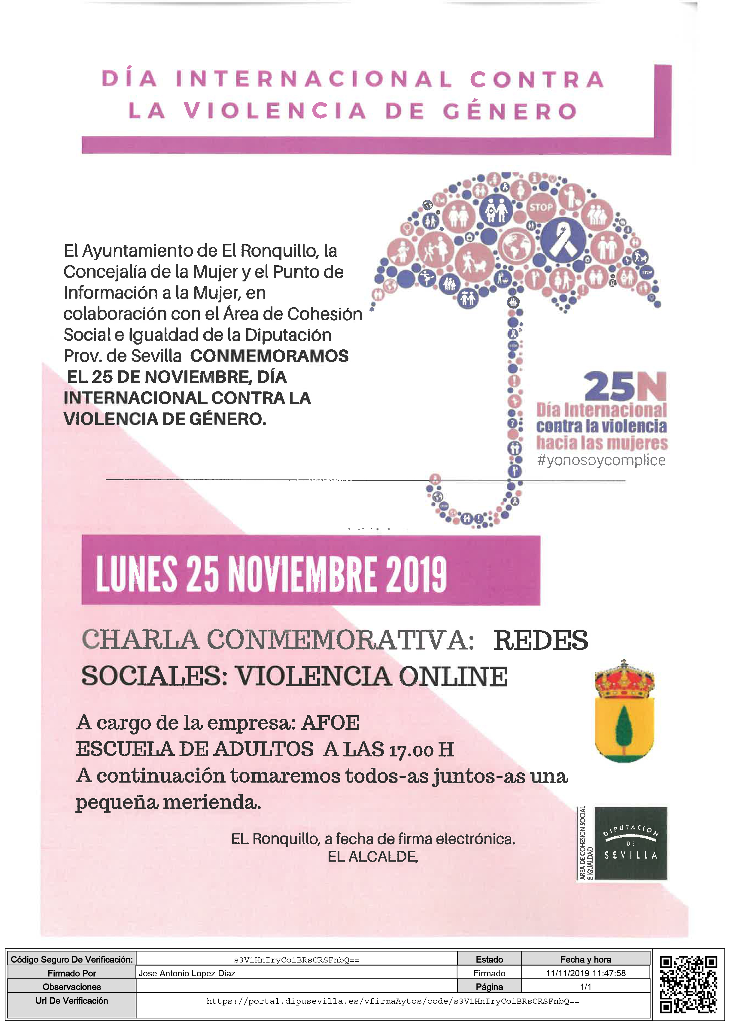 Desde el Ayuntamiento de El Ronquillo, la Concejalía de la Mujer y el Punto de Información a la Mujer, en colaboración con el Área de Cohesión Social e Igualdad de la Diputación Provincial de Sevilla conmemoramos el 25 de noviembre, Día Internacional Contra la Violencia de Género con una charla sobre la violencia online, a cargo de la empresa AFOE, a la que os animamos a asistir a tod@s.