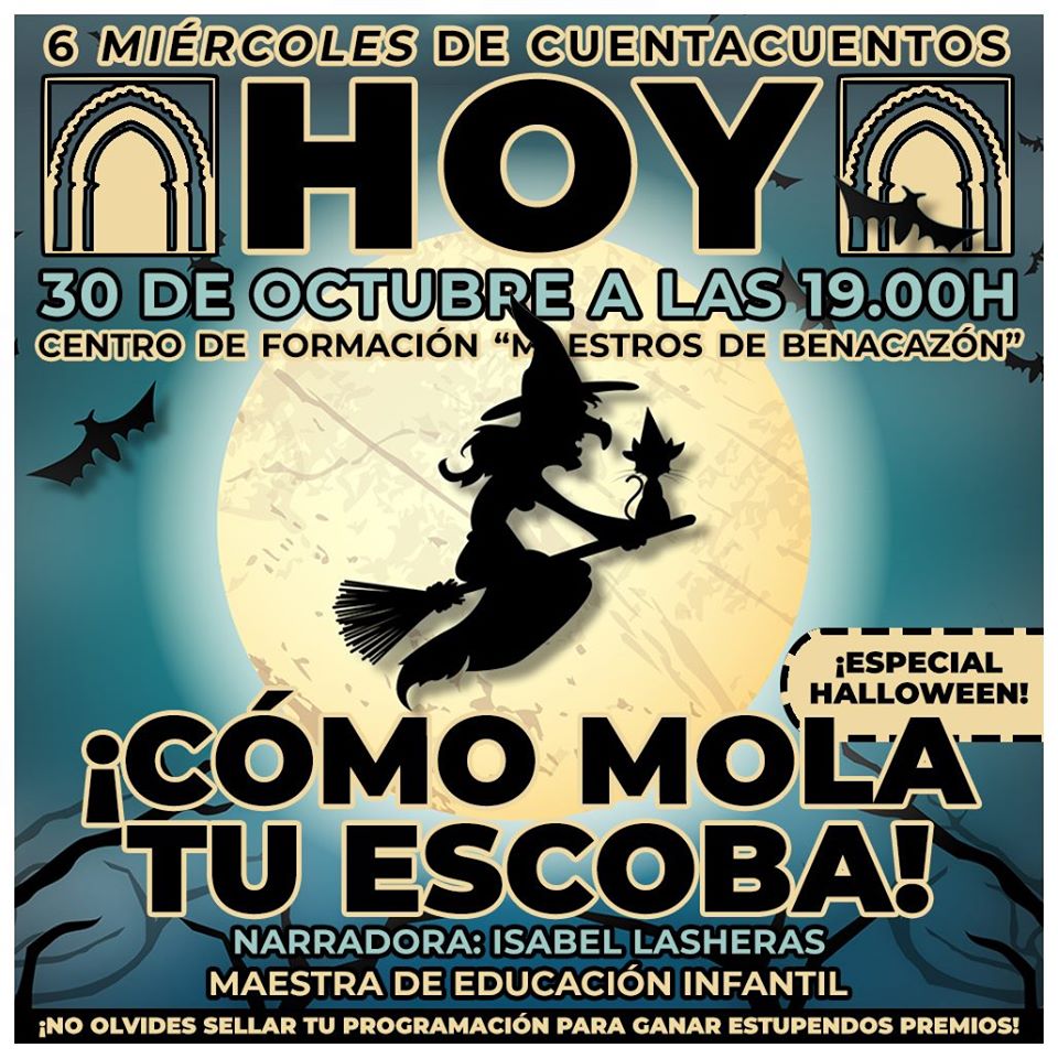 "¡Cómo mola tu escoba!", incluido en la programación de Halloween, tendrá lugar hoy miércoles 30 de octubre a las 19.00 horas en el Centro de Formación "Maestros de Benacazón" y será narrado por Isabel Lasheras, maestra de Educación Infantil. "Cómo mola tu escoba" de Julia Donalson nos cuenta las divertidas peripecias de una bruja y su gato que, a pesar del fuerte viento, tratan de volar en escoba sin que nada se les caiga por el camino. Tras la narración, los asistentes realizarán una manualidad relacionada con la historia y podrán sellar su programación para ganar estupendos premios.