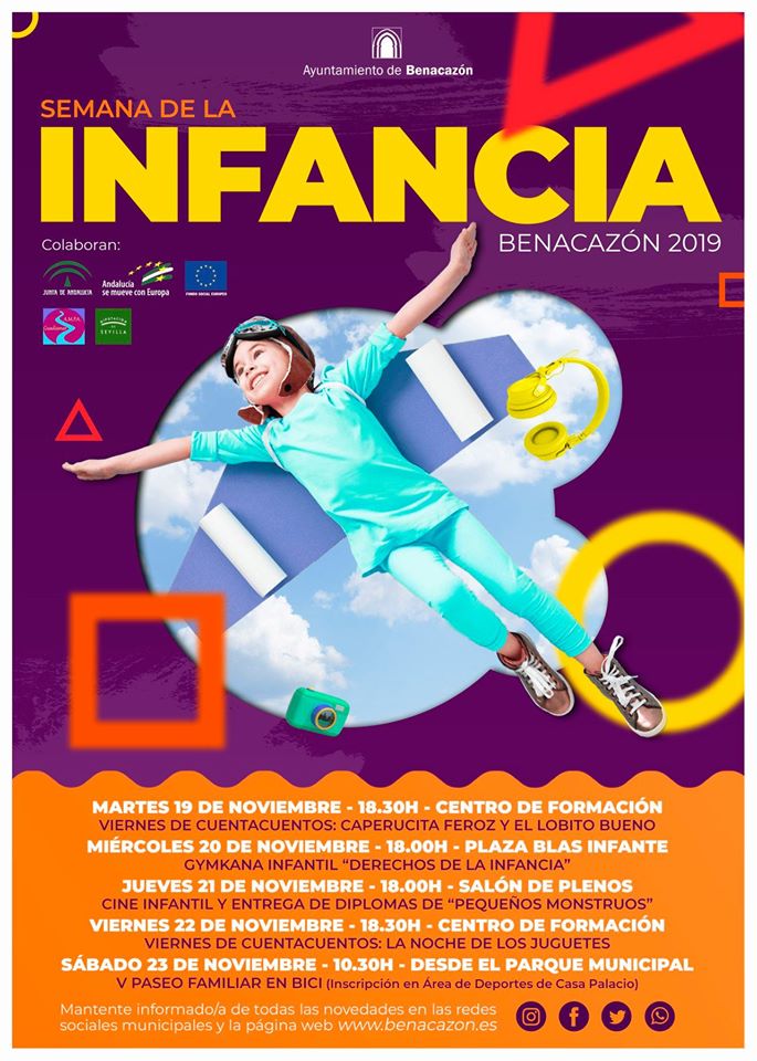 Desde el Ayuntamiento de Benacazón te informamos sobre la Semana de la Infancia 2019 organizada por nuestro Área municipal de Infancia, que incluirá una serie de divertidas actividades formativas, deportivas, culturales y de ocio para los más pequeños vecinos de la localidad.