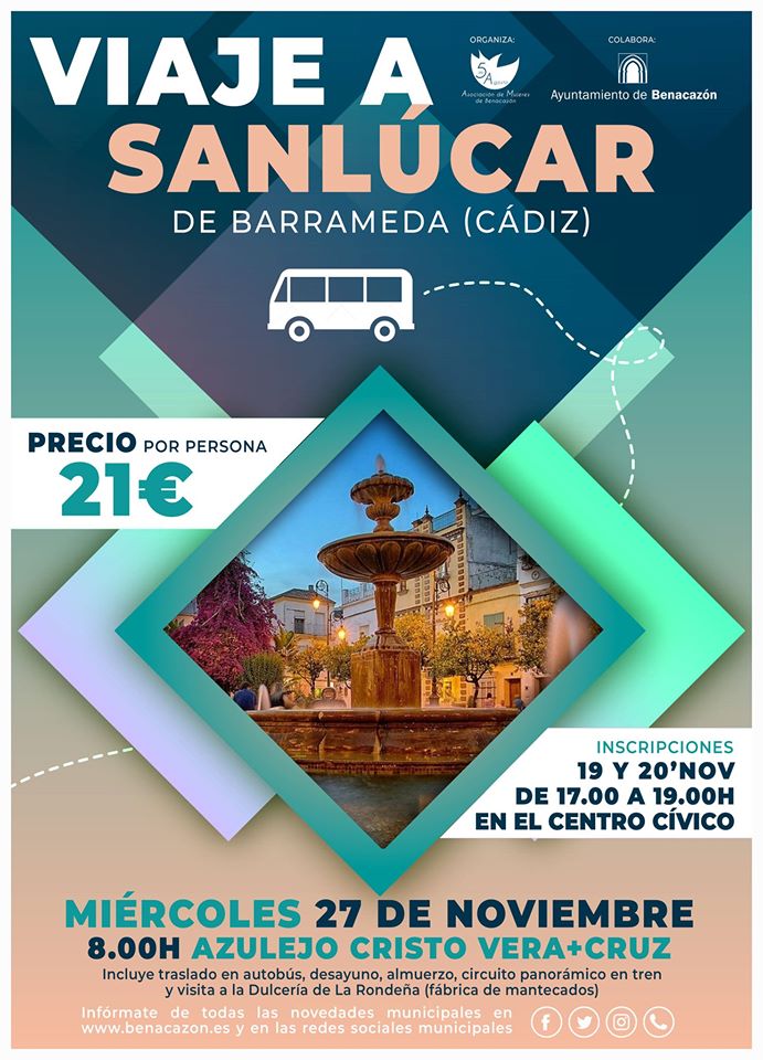 Desde el Ayuntamiento de Benacazón te informamos sobre el viaje organizado por la Asociación de Mujeres "5 de agosto" de Benacazón a Sanlúcar de Barrameda (Cádiz) el miércoles 27 de noviembre de 2019. Este viaje turístico y cultural de la Asociación de Mujeres cuenta con la colaboración del Ayuntamiento de Benacazón en su difusión.