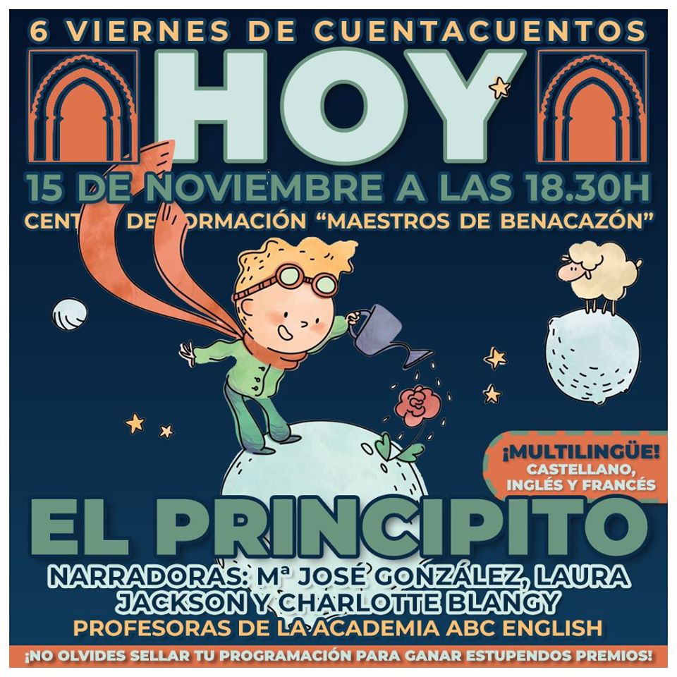 "El Principito" tuvo lugar el pasado viernes 15 de noviembre en el Centro de Formación "Maestros de Benacazón" y fue narrado en tres idiomas (castellano, inglés y francés) por Mª José González, Laura Jackson y Charlotte Blangy respectivamente, profesoras de la Academia ABC English. "El Principito" de Antoine de Saint-Exupéry cuenta la historia de un pequeño príncipe que parte de su asteroide a una travesía por el universo, en la cual descubre la extraña forma en que los adultos ven la vida y comprende el valor del amor y la amistad. Tras la narración, los asistentes realizaron una manualidad relacionada con la historia y pudieron sellar su programación para ganar estupendos premios.