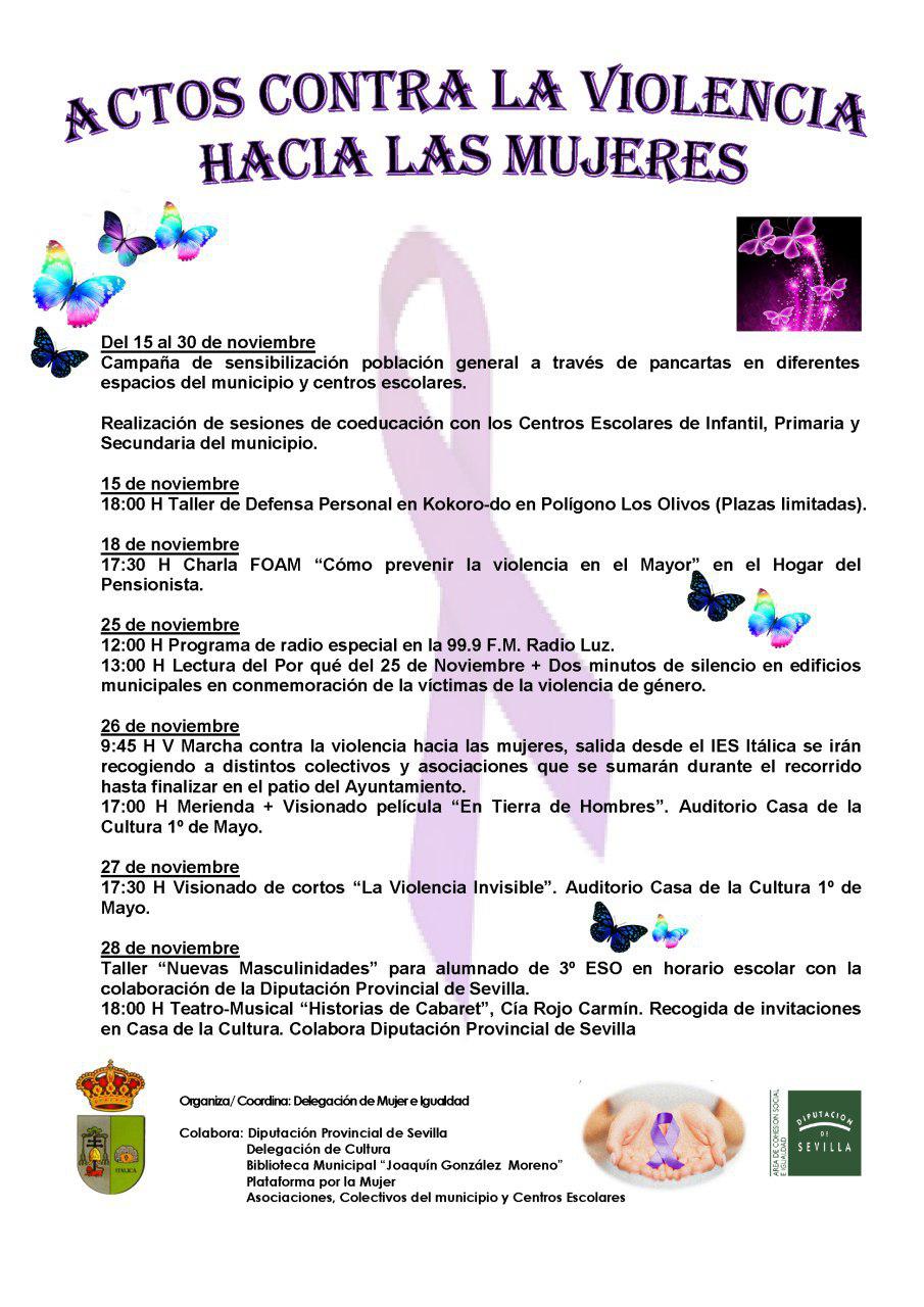 9:45 H V Marcha contra la violencia hacia las mujeres, salida desde el IES Itálica se irán recogiendo a distintos colectivos y asociaciones que se sumarán durante el recorrido hasta finalizar en el patio del Ayuntamiento.