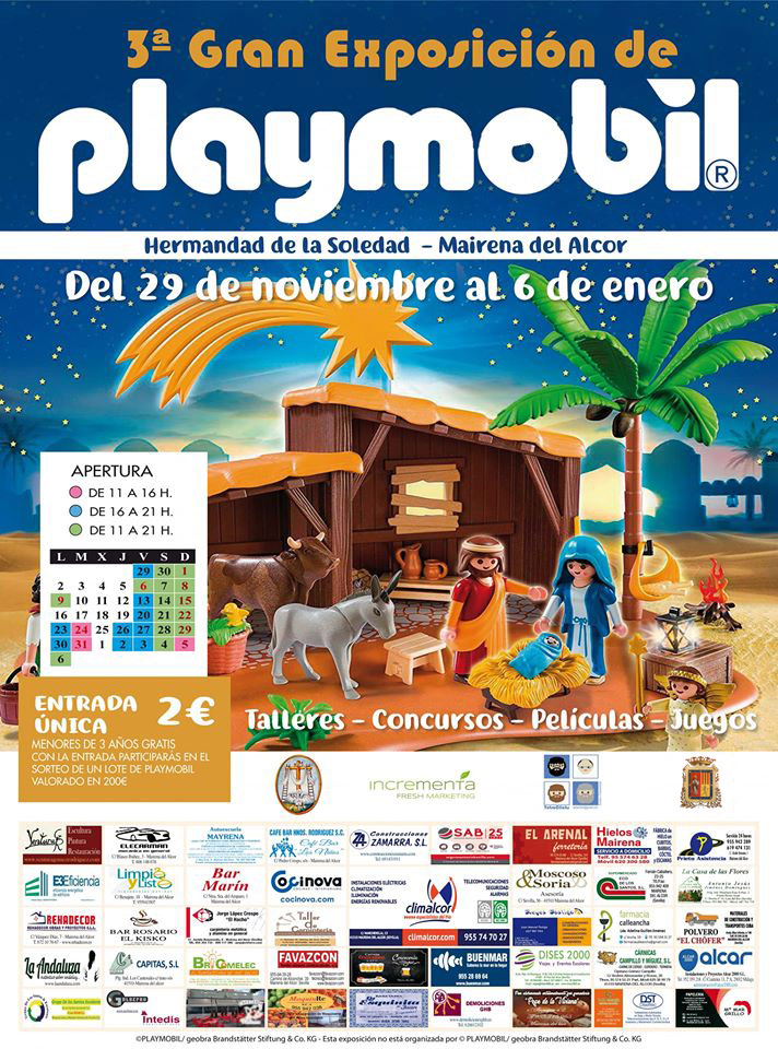La Hermandad de la Soledad organiza desde el viernes 29 de noviembre hasta el lunes 6 de enero de 2020, una nueva Gran Exposición de Playmobil®, en su Casa Hermandad (C/ Trianilla, 30) con la colaboración del Ayuntamiento de Mairena del Alcor.