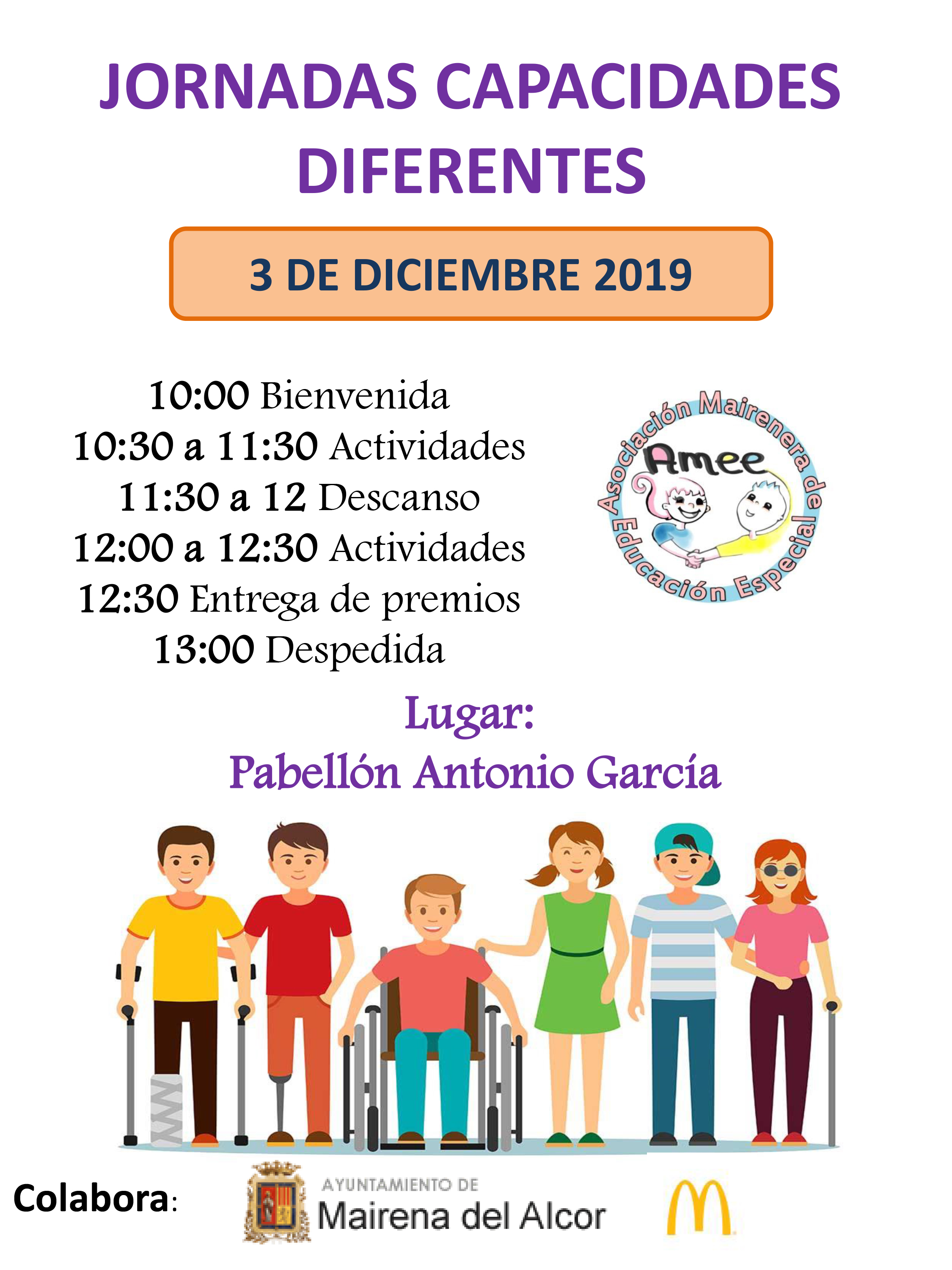 La Asociación Mairenera de Educación Especial (AMEE) con la colaboración del Ayuntamiento de Mairena del Alcor, organiza las Jornadas Capacidades Diferentes el martes 3 de diciembre a las 10.00 horas en el Pabellón Antonio García Martínez.