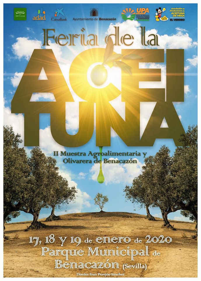 Desde el Ayuntamiento de Benacazón tenemos el placer de mostrarte el cartel de la Feria de la Aceituna, II Muestra Agroalimentaria y Olivarera de Benacazón, un macroevento que tendrá lugar los días 17, 18 y 19 de enero de 2020, promovido por el Ayuntamiento de Benacazón, la Unión de Pequeños Agricultores y Ganaderos (UPA) y la Asociación de Productores de Aceituna de Mesa "El Verdeo", con la colaboración de la Diputación de Sevilla, la Asociación para el Desarrollo de la comarca Aljarafe-Doñana (ADAD) y Caixabank.