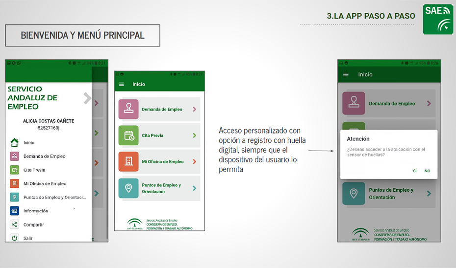 Con la nueva aplicación, también es posible localizar en el mapa las unidades de orientación de la red Andalucía Orienta y los puntos de empleo, así como sincronizar las fechas de renovación y citas con la agenda personal instalada en el dispositivo. Para acceder al aplicativo, una vez descargado en el dispositivo, es necesario un usuario y contraseña que coincide con el de acceso validado al área de gestión ubicada en el portal del SAE. En caso de no tener usuario, se debe acudir a la oficina de empleo.