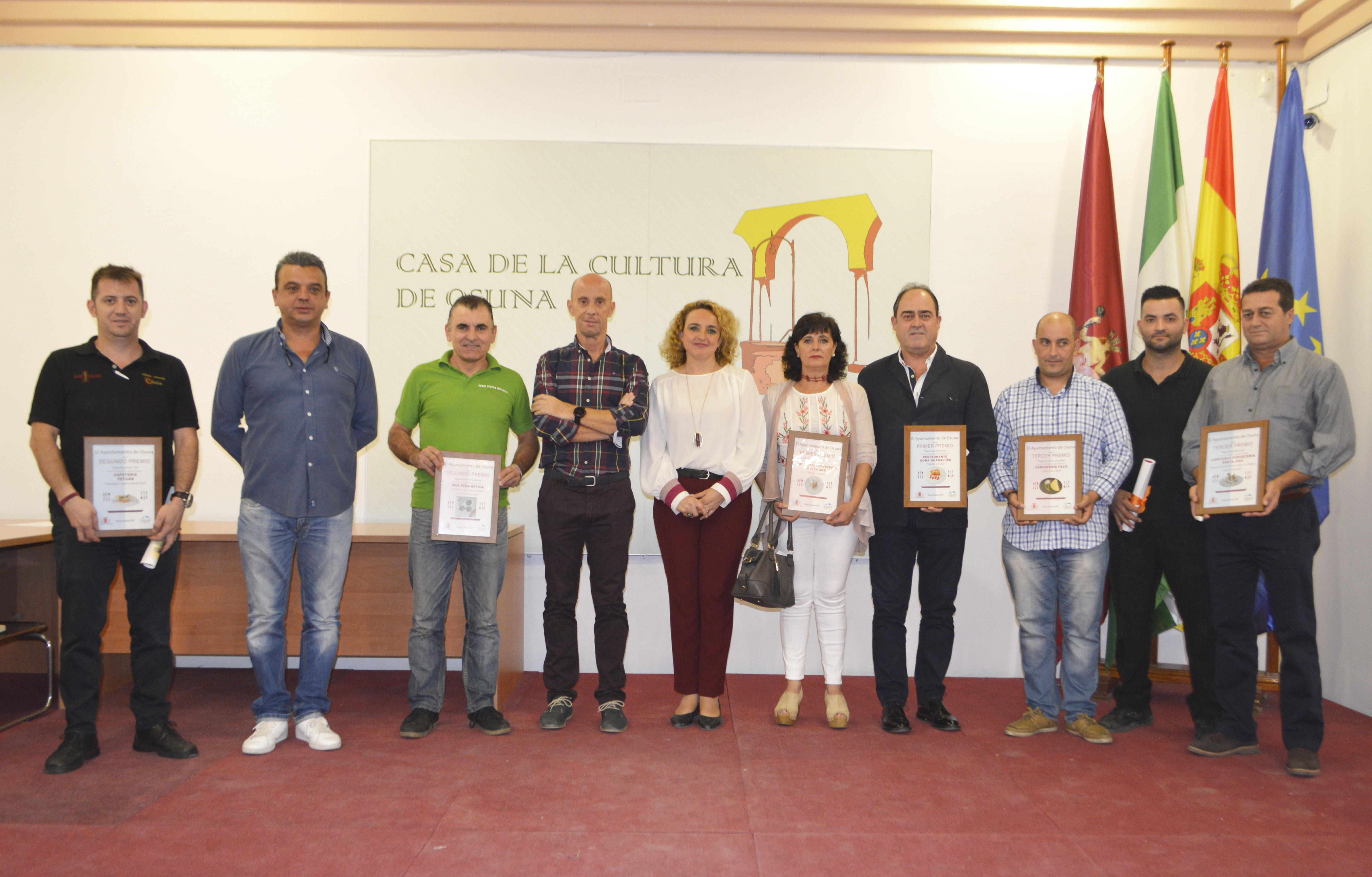 Además de estos tres máximos premios para la versión de "tapa gourmet fría" y tres máximos premios para la "tapa gourmet caliente", desde el Ayuntamiento de Osuna se ha entregado un reconocimiento a todos los bares y restaurantes participantes y a todos los patrocinadores.