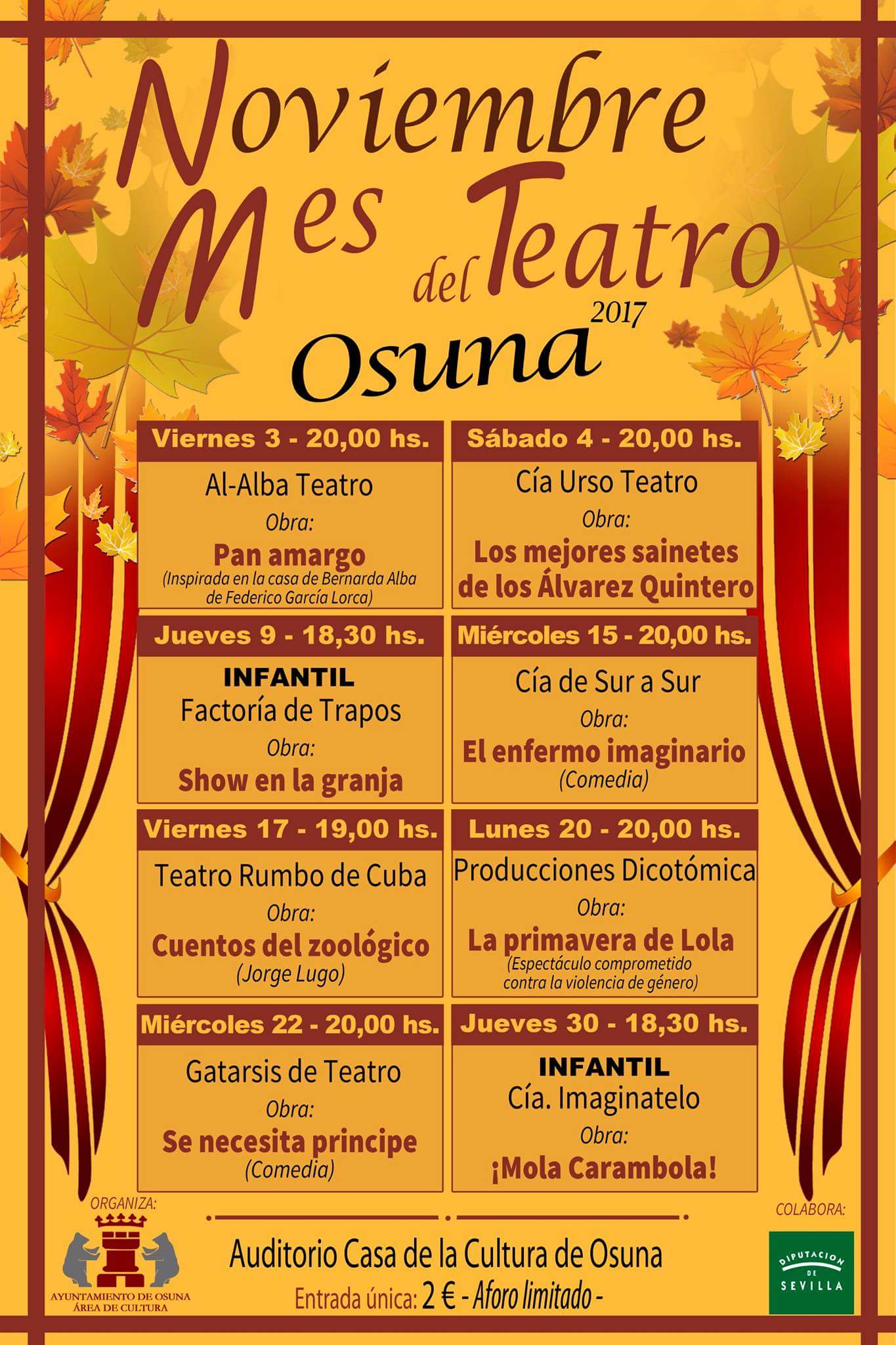 La Delegación Municipal de Cultura del Ayuntamiento de Osuna dedica este mes de noviembre al teatro. Una interesante apuesta cultural por las artes escénicas con una completa programación y variada temática y estilos. Un total de ocho representaciones, la primera de las cuales tuvo lugar el pasado 3 de noviembre con la obra "Pan amargo", que puso en escena la Compañía "Al Alba Teatro".