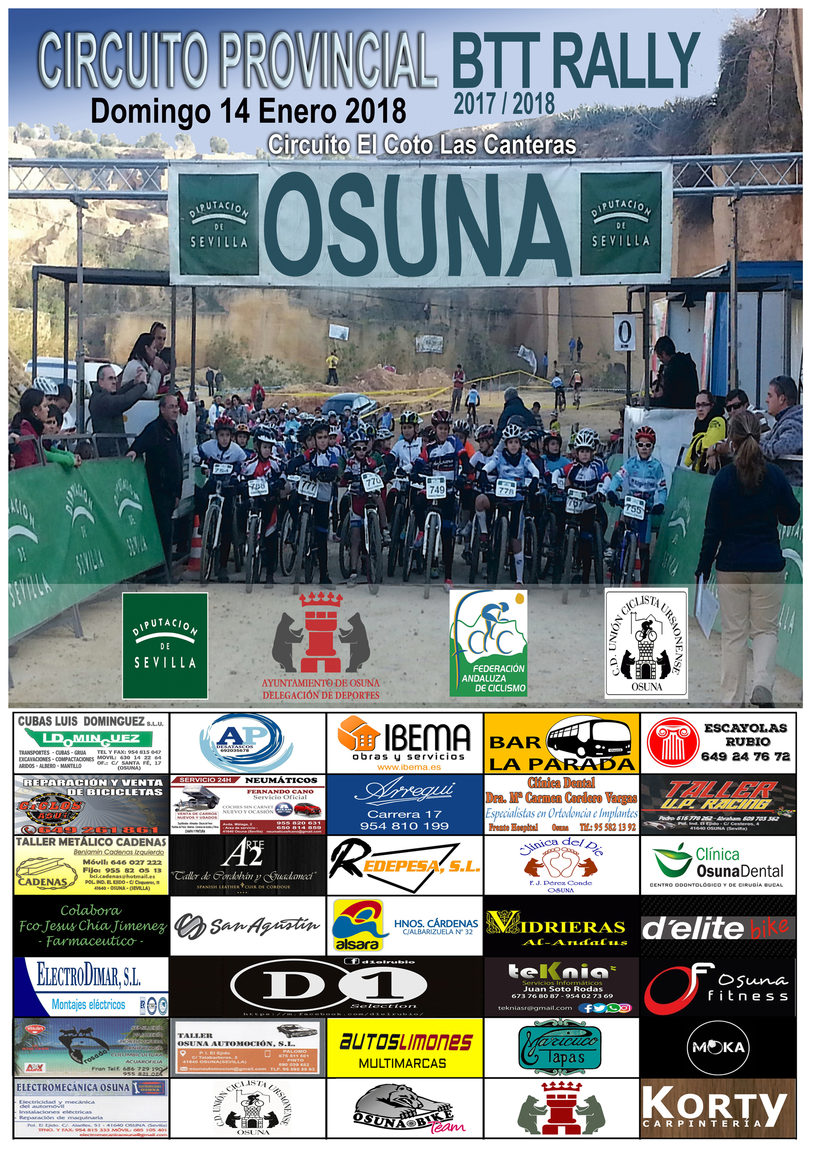 El Coto – Las Canteras de Osuna vuelve a ser el escenario en el que se celebrará este próximo domingo, 14 de enero, la tercera de las cinco pruebas que integran el Circuito Provincial BTT Rally que organiza la Diputación de Sevilla, en colaboración con el Ayuntamiento de Osuna, la Federación Andaluza de Ciclismo y el Club Deportivo Unión Ciclista Ursaonense.
