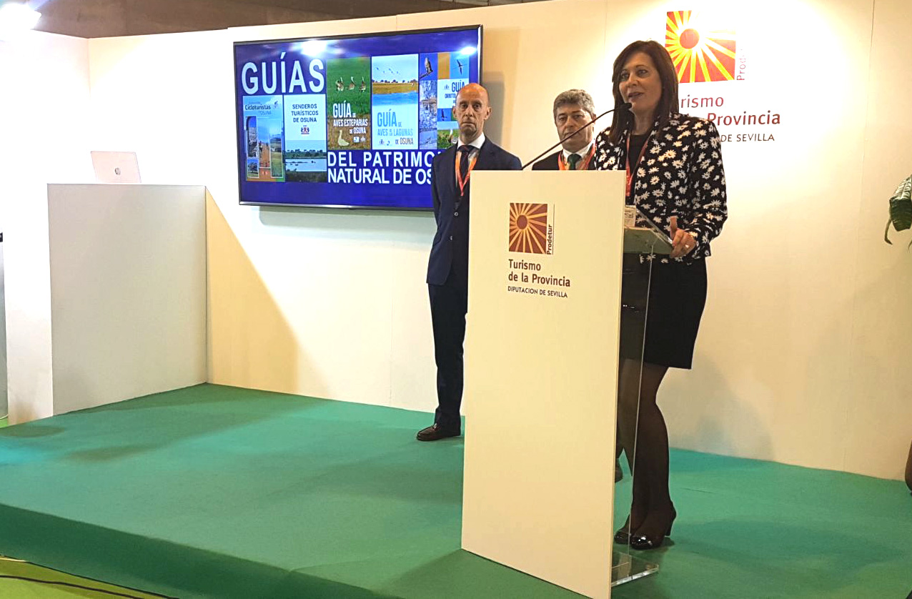 En la mañana de hoy viernes, 19 de enero, la alcaldesa de Osuna, Rosario Andújar, ha presentado en el stand de Sevilla del pabellón de Andalucía, en la Feria Internacional de Turismo (Fitur), que se celebra esta semana en Madrid, las nuevas Guías del Patrimonio Natural de Osuna que se han diseñado y editado, y que recogen completa información sobre ornitología, aves esteparias y el complejo endorreico de las lagunas, así rutas cicloturísticas y senderos turísticos del término municipal."
