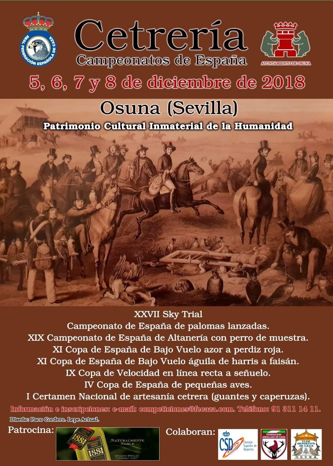 Osuna vuelve a ser sede de los Campeonatos de España de Cetrería, que este año 2018 se van a celebrar durante los días 5 a 8 de diciembre, organizados por la Real Federación Española de Caza (RFEC) con la colaboración del Ayuntamiento de Osuna, de la Federación Andaluza de Caza y el Club Deportivo de Caza de Osuna, así como del Consejo Superior de Deportes.