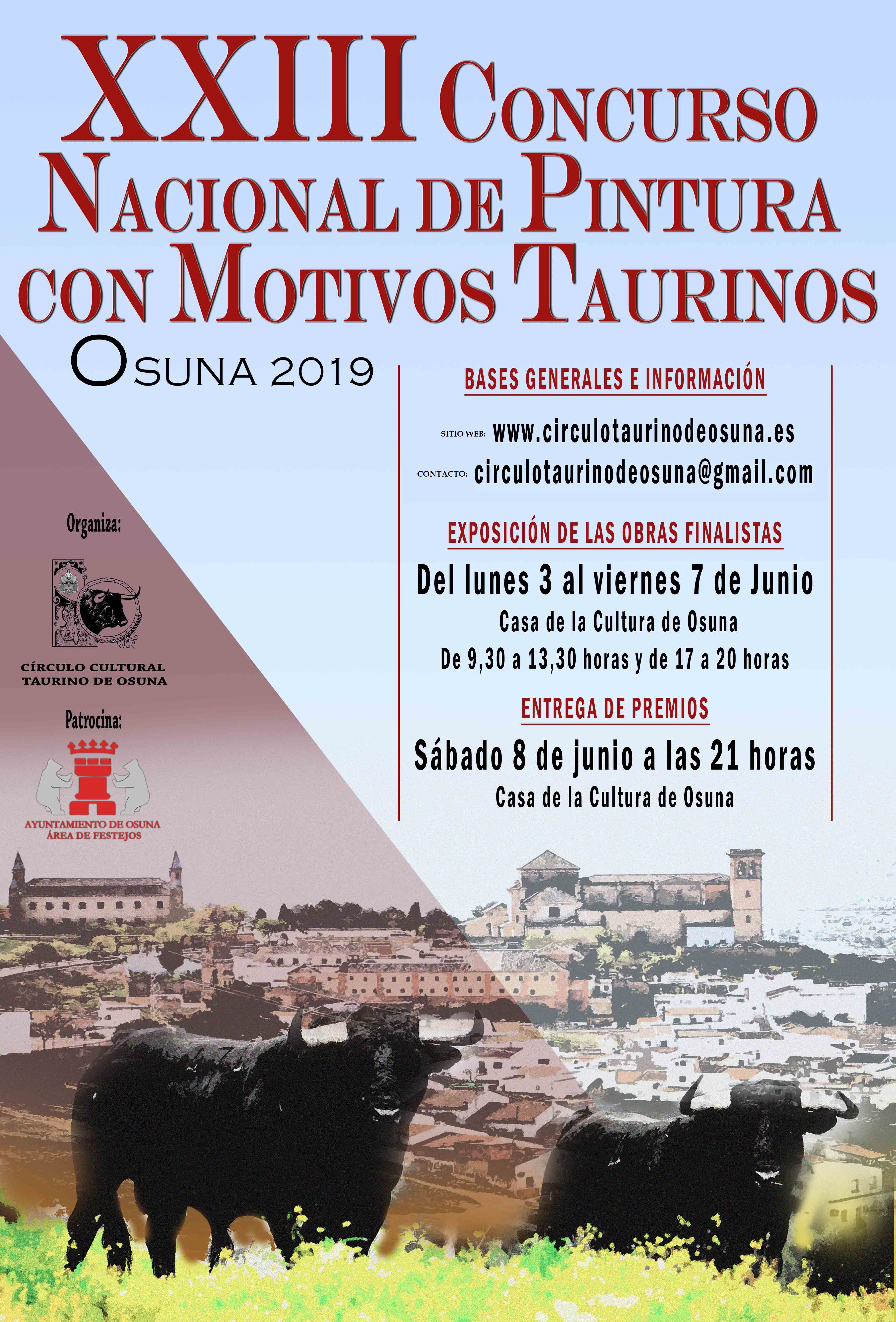 El Círculo Cultural Taurino de Osuna ha abierto la convocatoria del XXIII Concurso Nacional de Pintura con motivos Taurinos 2019, con el que se pretende poner en valor la gran vinculación con las distintas artes, en este caso con la pintura, que tiene la tauromaquia.