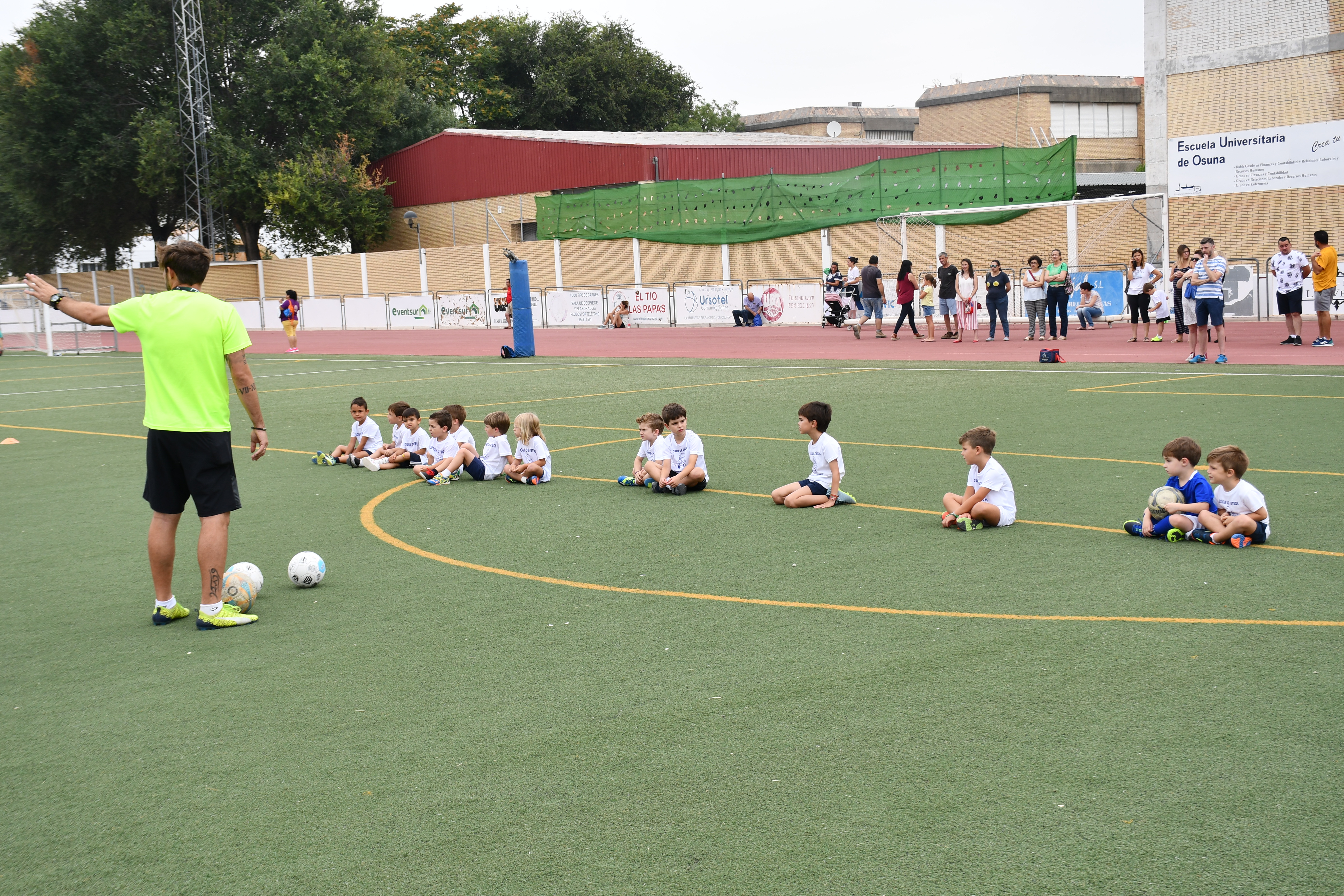 El programa de la escuela de fútbol, que se desarrolla en el campo de césped artificial de fútbol 11 del Polideportivo de Osuna, comprende tres sesiones semanales con horario matinal, de 10 a 11 o de 11 a 12.