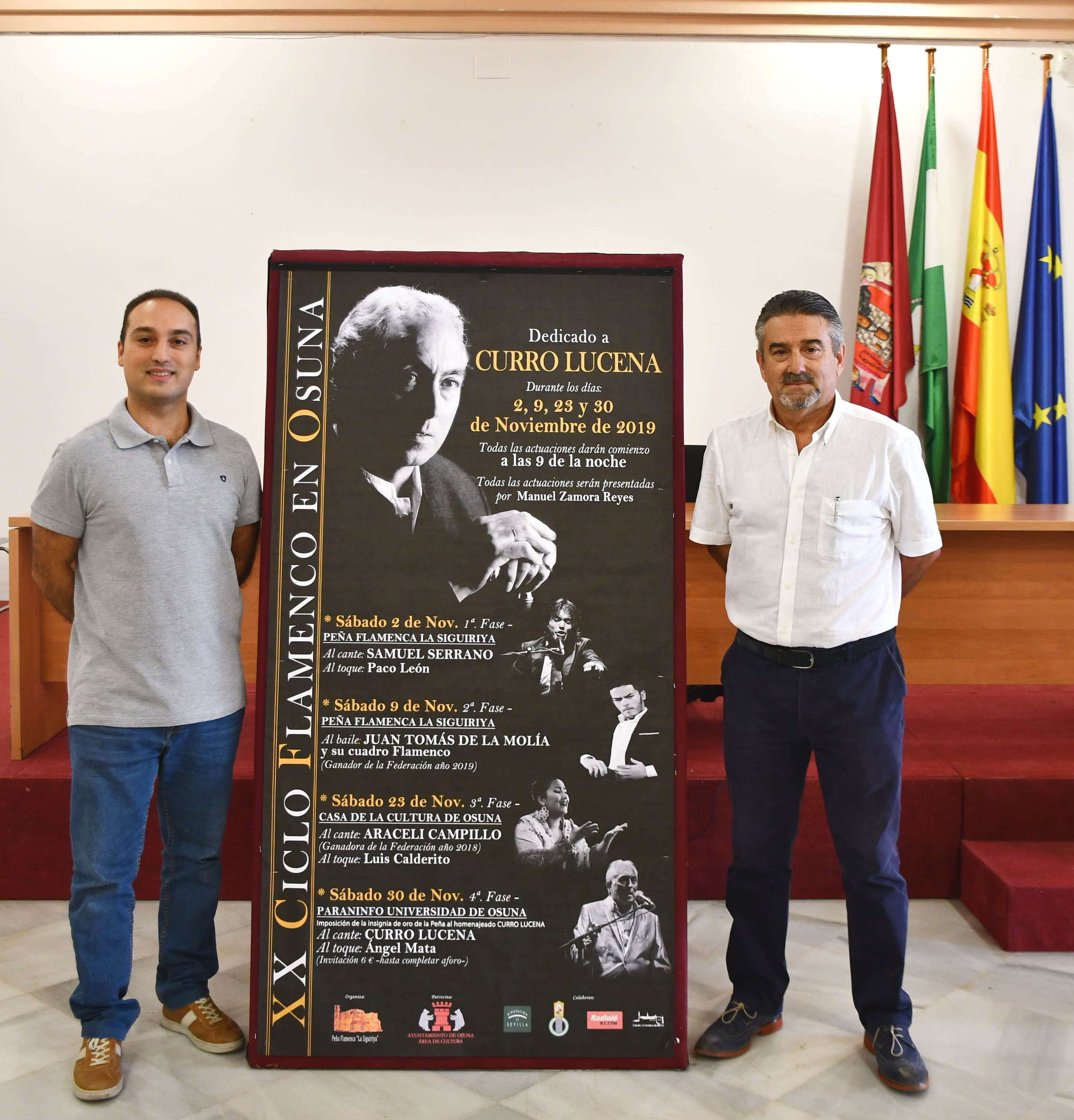 Un ciclo dedicado al cantaor flamenco Curro Lucena, y que ha sido presentado en la Casa de la Cultura de Osuna por el delegado municipal de Cultura, Jesús Heredia, acompañado por el presidente de la Peña Flamenca, Manuel Zamora.