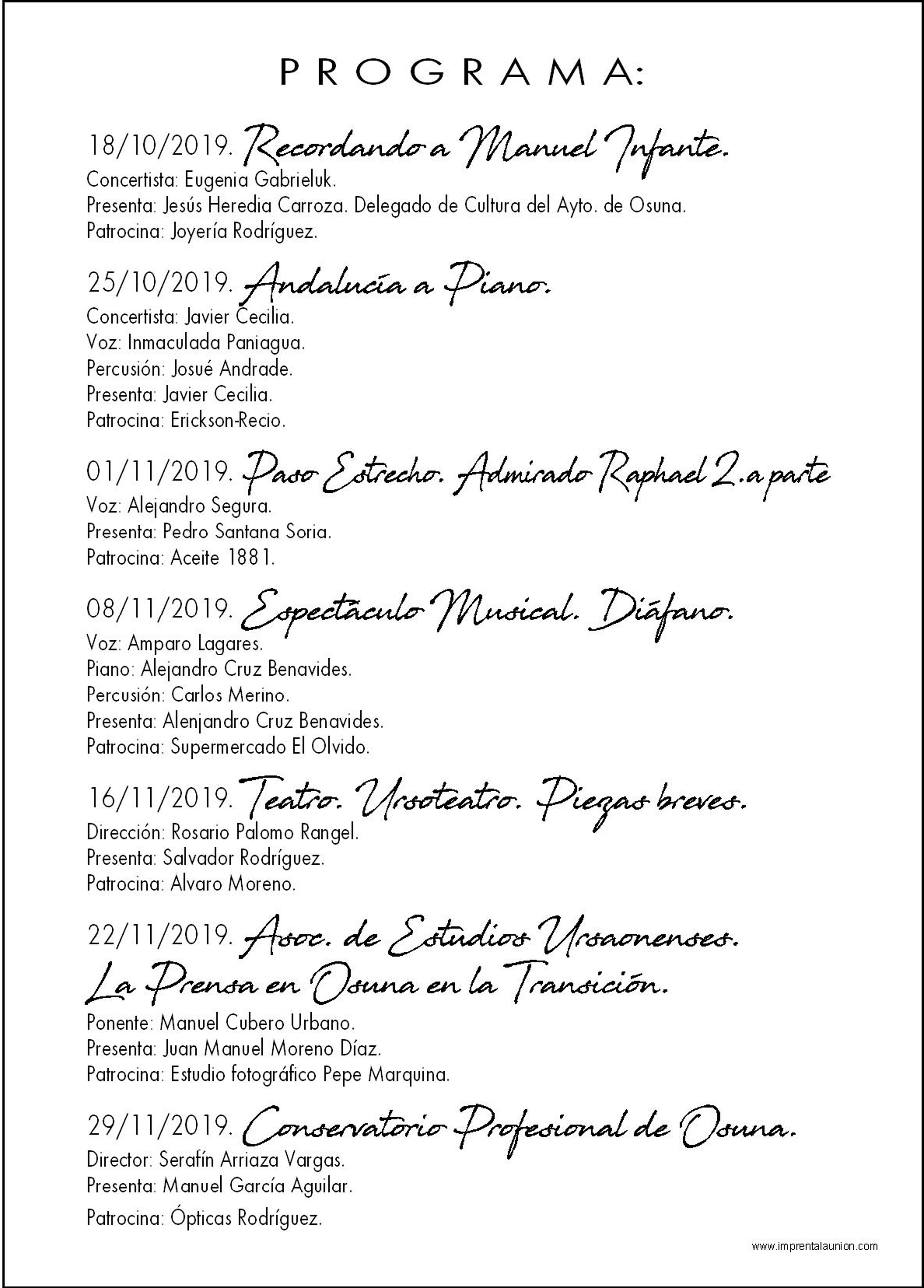 Los actos comenzaran el viernes 18 de octubre, con el acto 'Recordando a Manuel Infante', músico nacido en Osuna que llegó a dirigir la Ópera de París. La calle Juan de Vera, lugar donde nació, acogerá el descubrimiento de un azulejo por parte del delegado municipal de Cultura del Ayuntamiento de Osuna, Jesús Heredia. Posteriormente, la concertista rusa Eugenia Gabrieluk, ofrecerá un concierto a piano, con piezas de Manuel Infante en el salón de actos del Casino.