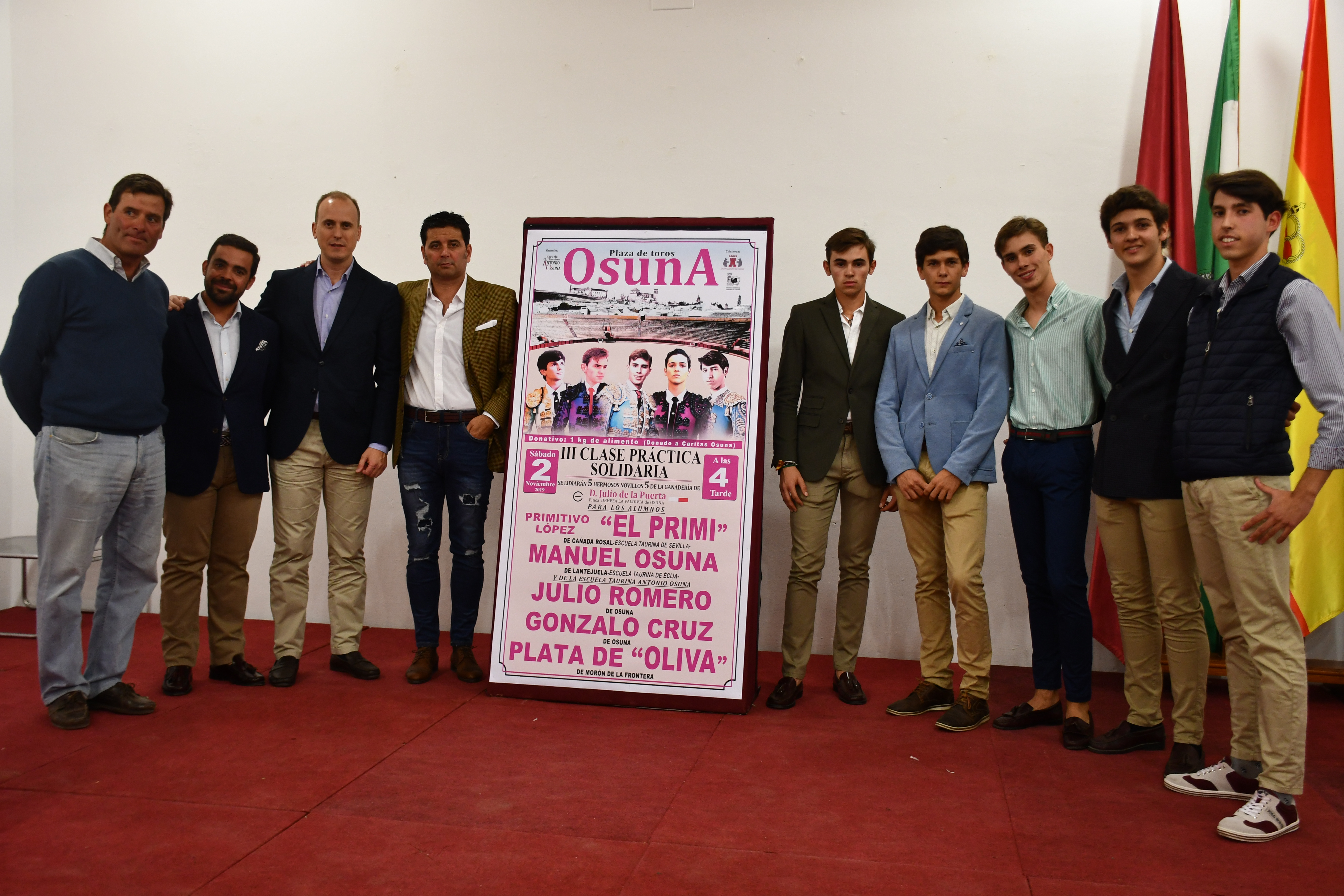 En la tarde noche de ayer, 17 de octubre, el Salón de Actos de la Casa de la Cultura de Osuna acogía la presentación del cartel de la tercera clase práctica que tendrá lugar el próximo sábado 2 de noviembre a las 16:00 horas, con la que se pondrá fin a la temporada taurina 2019 de nuestra localidad y comarca, siendo la plaza de toros de Osuna la plaza de su categoría que más festejos ha vivido este año en Andalucía.