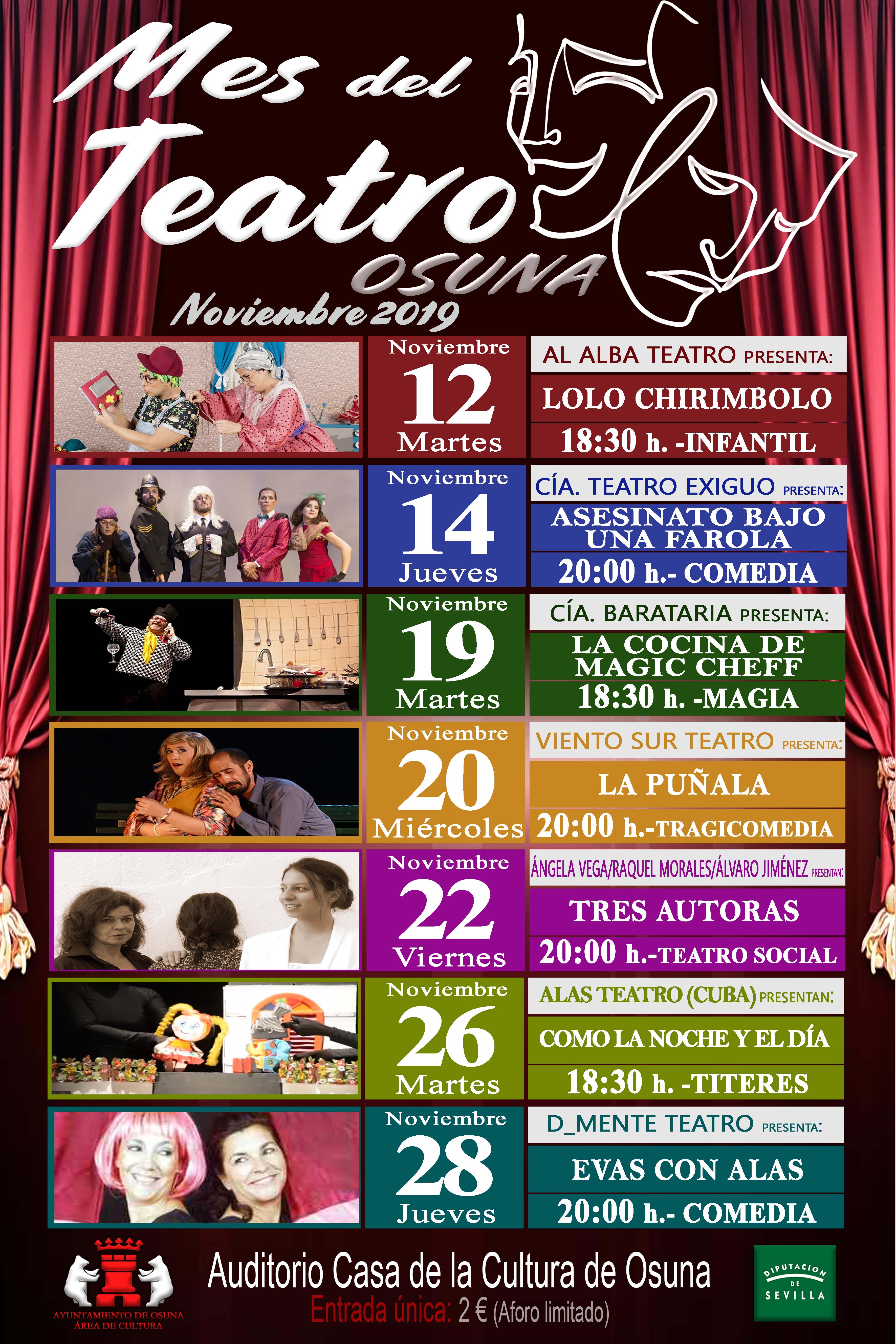 El jueves, 14 de noviembre, se representará la obra "Asesinato bajo una farola", de la compañía de teatro Exiguo, una comedia que tendrá lugar a las ocho de la tarde. Ya el martes, 19, a las 18.30 horas, la magia será la protagonista con el espectáculo "La cocina de Magic Chef", de la compañía Barataria. El estilo de la tragicomedia vendrá de la mano de la compañía Viento Sur Teatro, con la obra "La Puñalá", que será representada el 20 de noviembre a las 20.00 horas.