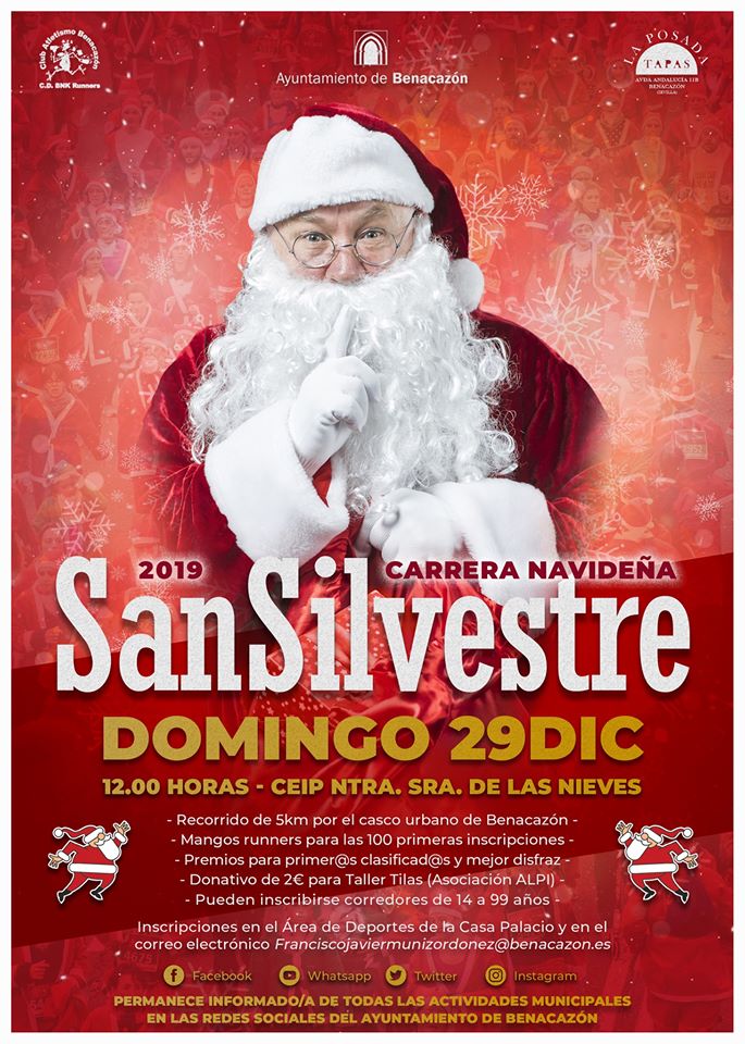 Desde el Ayuntamiento de Benacazón te informamos sobre la Carrera Navideña "San Silvestre 2019", un evento organizado por nuestro Área municipal de Deportes, por primera vez en nuestro municipio con la colaboración del club local de atletismo "BNK Runners" y La Posada Tapas. Esta carrera tendrá lugar a las 12.00 horas del domingo 29 de diciembre desde la puerta del CEIP Ntra. Sra. de las Nieves y se desarrollará durante 5 kilómetros por el núcleo urbano de Benacazón.