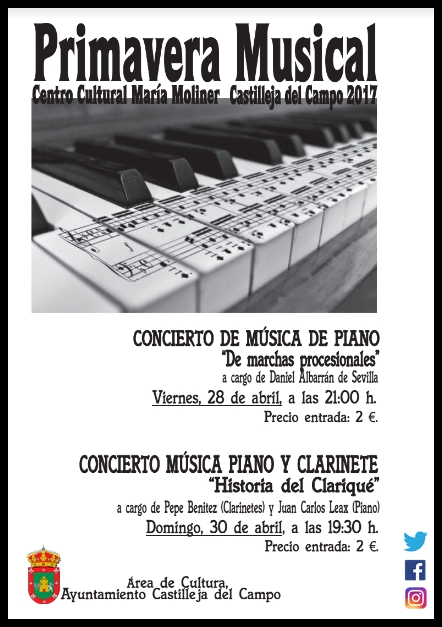 Concierto de Música de Piano ``De marchas procesionales´´ A cargo de Daniel Albarrán de Sevilla. Dia: Viernes, 28 de Abril 2017 Hora: 21:00 h. Precio: 2 €. Concierto Música Piano y Clarinete ``Historía del Clariqué´´ A cargo de Pepe Benitez ( Clarinete ) y Juan Carlos Leaz ( Piano ). Dia: Domingo, 30 de Abril 2017 Hora: 19:30 h. Precio: 2 €. * Todos los actos se celebrará en el Centro Cultural María Moliner de Castilleja del Campo, C/ Vista Alegre Nº 30. Área de Cultura, Ayto. Castilleja del CampoImagen